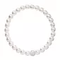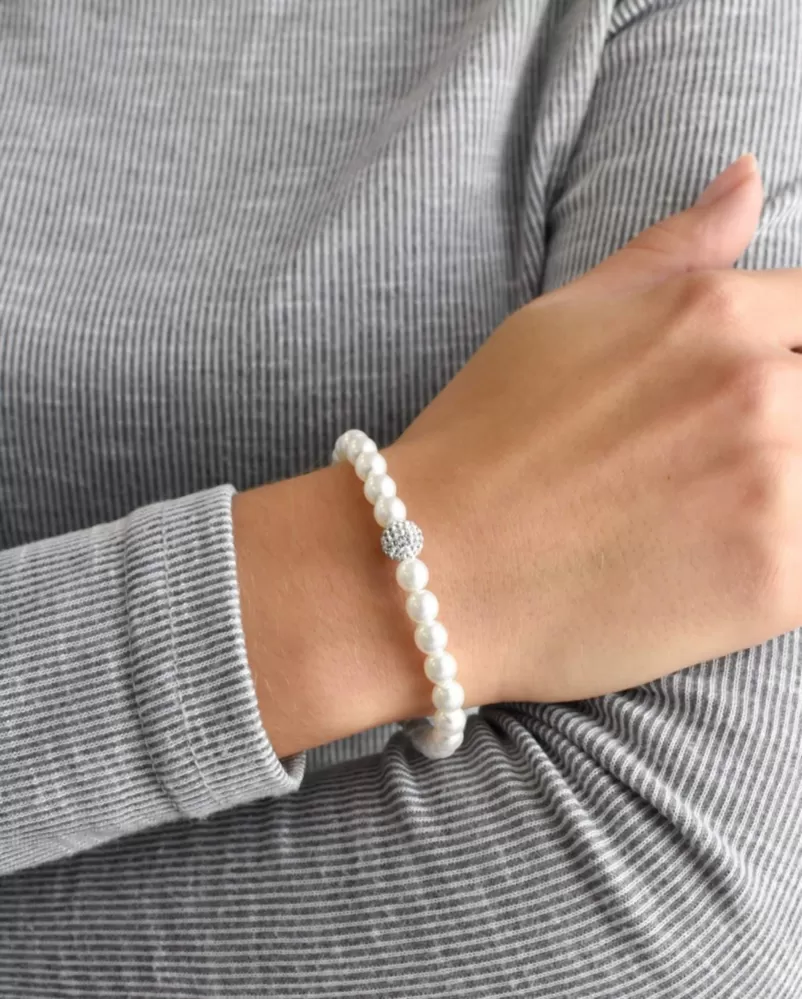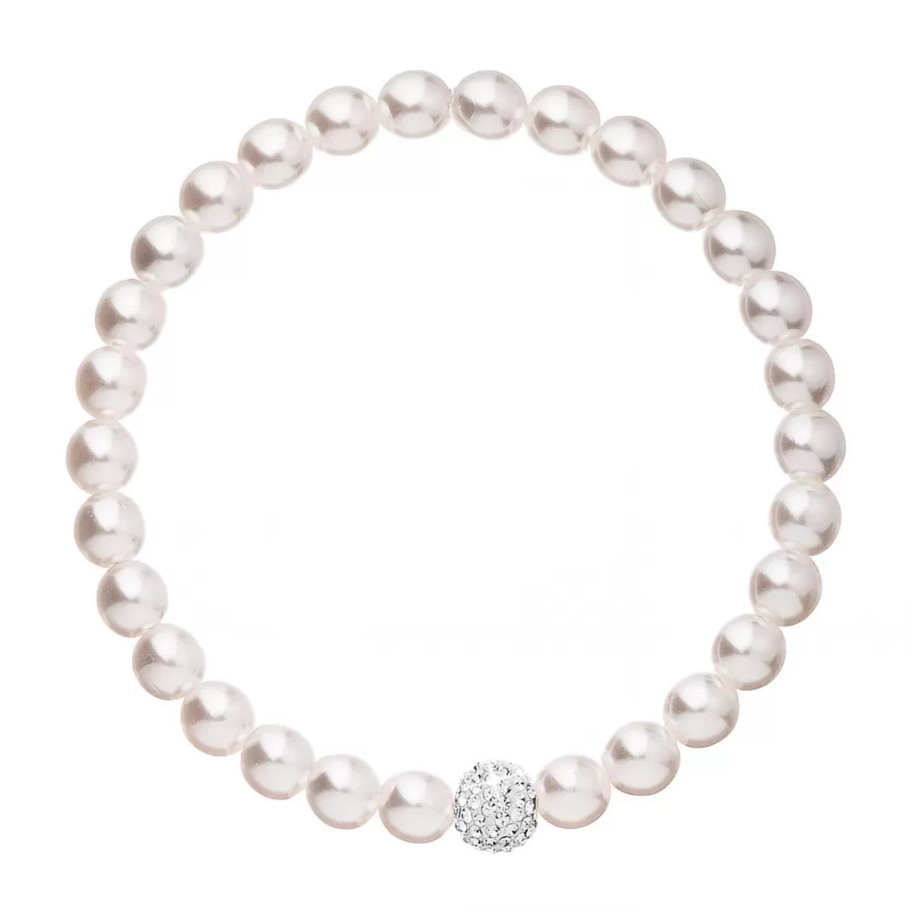 Perlový náramok 33115.1 V dĺžke 16 cm je poskladaný z malých bielych perál, medzi ktoré je navlečená gulička vysadená mnohými Preciosa kryštáliky v bielej farbe. Náramok je vhodný aj pre alergikov, neobsahuje totiž žiadny nikel.