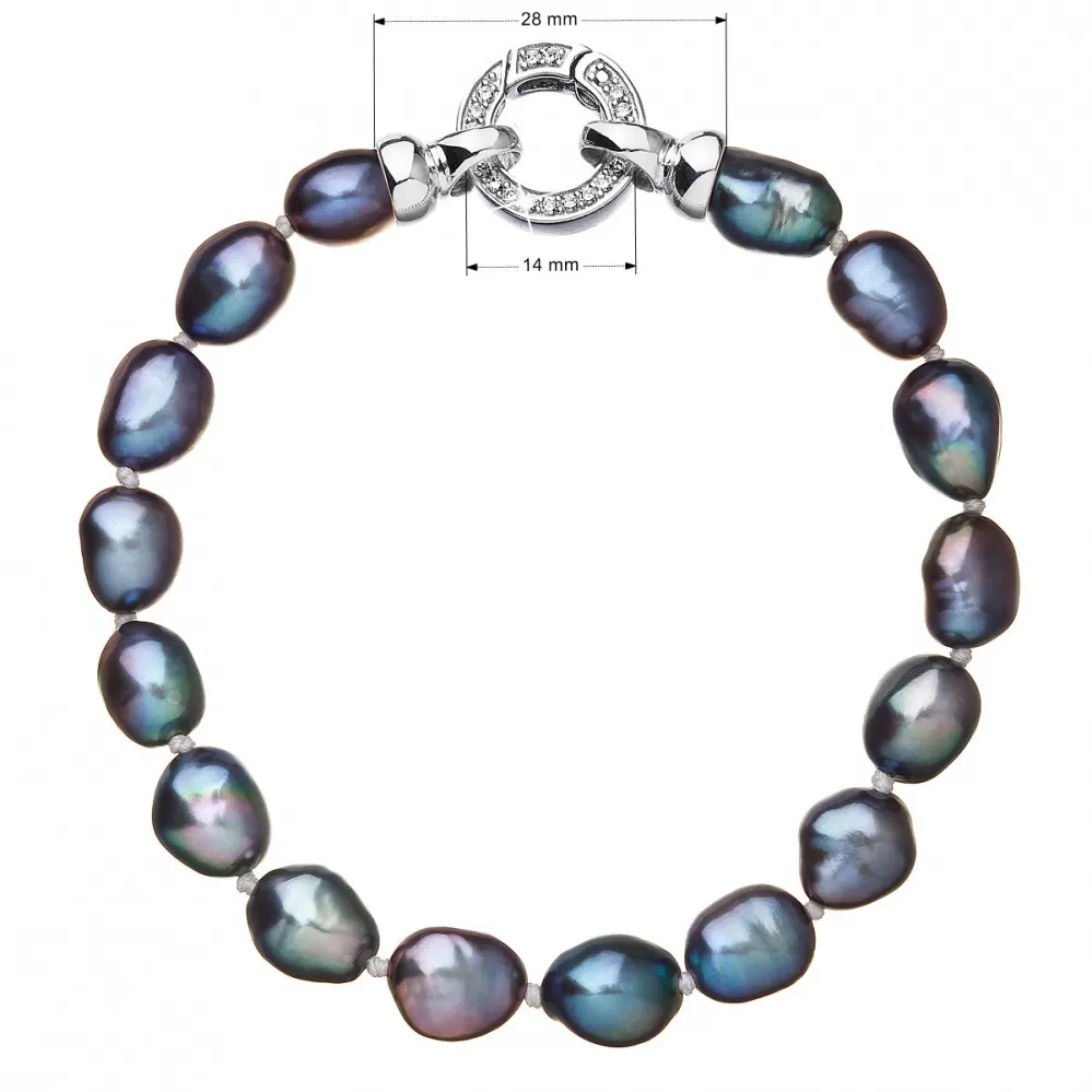 Perlový náramok 23011.3o dĺžke 19,5 cm je zložený z celkom 16 riečnych perál nepravidelného tvaru o veľkosti 8 - 8,5 mm. Perly spadajú do kategórie kvality A majú tmavomodrú farbu. strong>zaistená uzlíkovou väzbou, a tak sa pri nechcenom pretrhnutí náramku nestane, že sa vám perly rozkotúľajú na všetky strany. rýdzosť 925/1000 a ródiovú povrchovú úpravu. Náramok neobsahuje nikel, a tak ho môžu bez obáv nosiť aj alergici. Náramok z perál 23011.3 pre váspoctivo ručne navlieklinaše šikovné šperkárky. Ručnú prácu vám doloží pečať kvality, ktorú výrobok obsahuje. /strong>, ktorý nájdete priložený v krabičke u šperku.