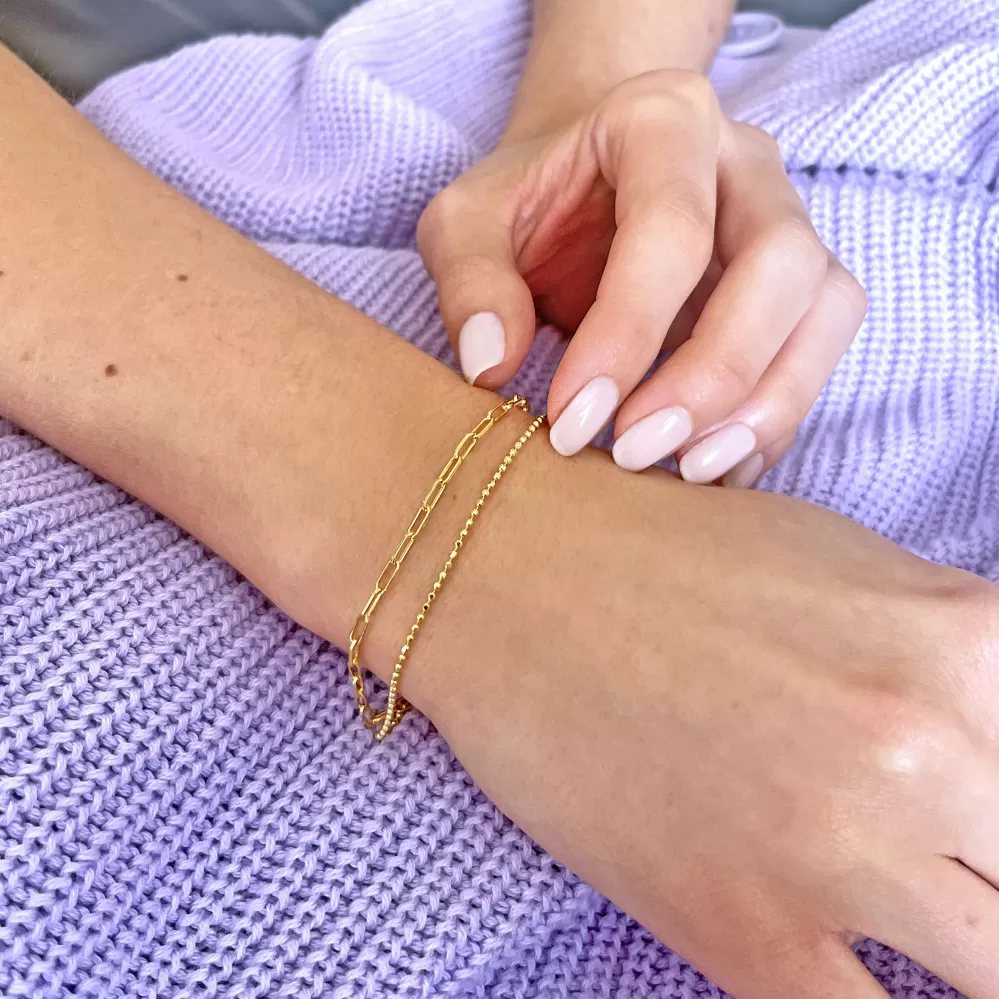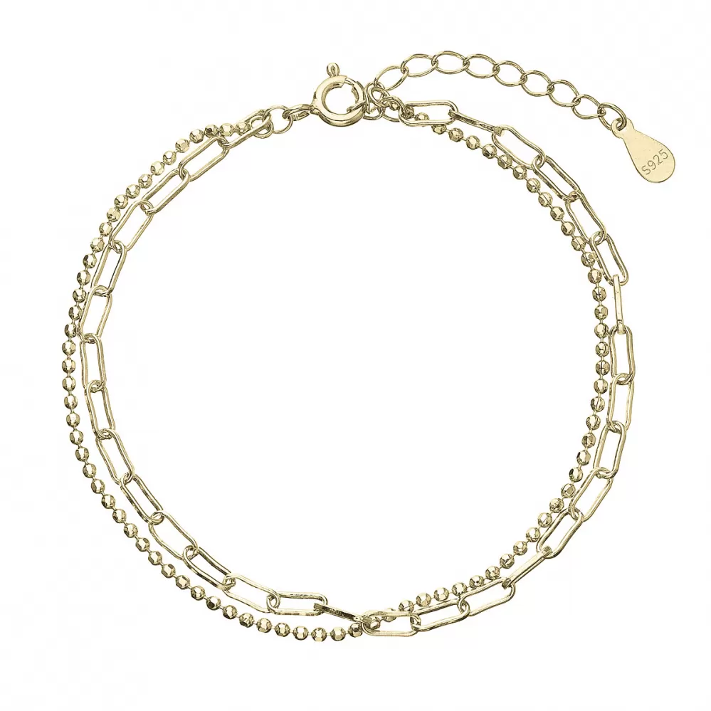 Neschovávajte svoje zápästie pod dlhým rukávom, zvýraznite ho moderným pozláteným náramkom z dvojitej retiazky v rôznom tvare. Jedná retiazka je v tvare oválnych očiek a druhá guličiek.