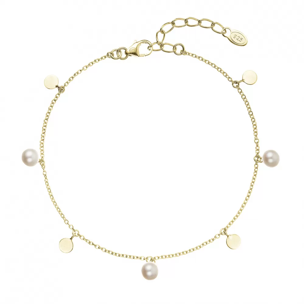 Veľmi nežne pôsobiaci jednoduchý náramok so žiarivými perlami a placičkami. Pozlátený náramok je vyrobený z pozláteného striebra rýdzosti 925/1000.… Celý popis