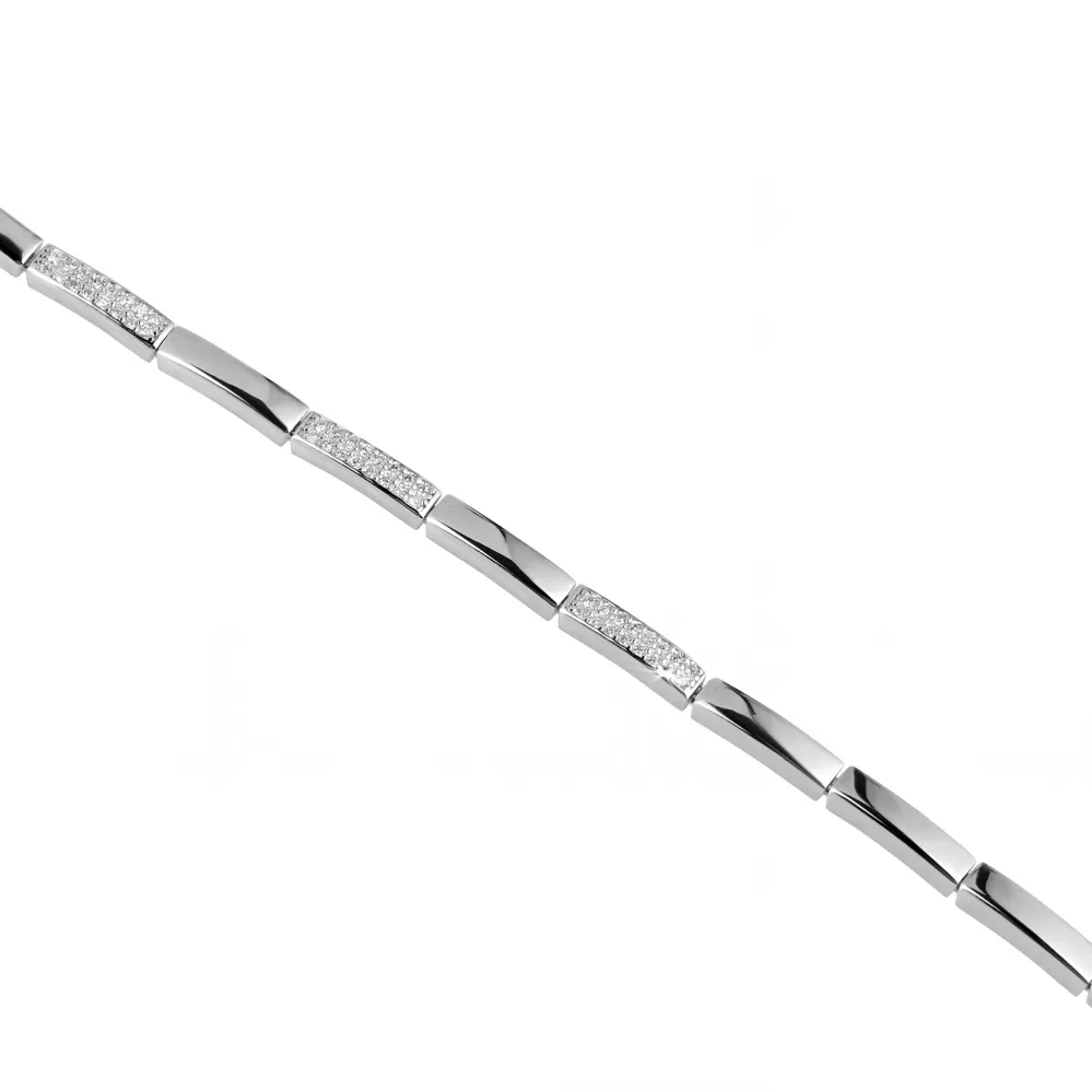Luxusný strieborný náramok, ktorý kombinuje eleganciu a moderný dizajn, je tvorený z radu lesklých obdĺžnikov a obdĺžnikov osadených zirkónmi.
