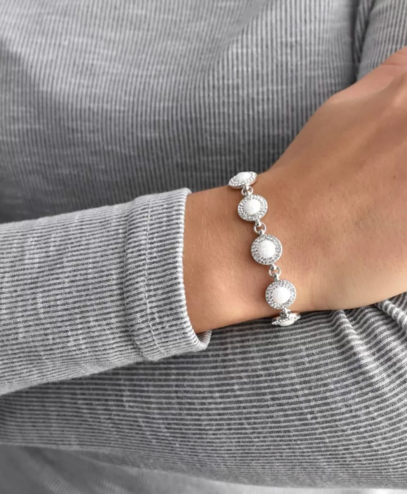 Strieborný náramok 33105.1 je vyrobený zo striebra rýdzosti 925/1000, ktorého povrch bol ošetrený ródiom. Rhodium šperk ochráni proti sčerneniu, zožltnutiu aj poškriabaniu. Náramok je zložený z niekoľkých strieborných koliesok, do ktorých je vsadený biely syntetický opál. Opál je navyše lemovaný dvoma radmi trblietavých Preciosa kryštálov v bielej farbe. Keďže náramokneobsahuje prídavok niklu, môžu ho bez obáv z alergickej reakcie nosiť aj alergici.
