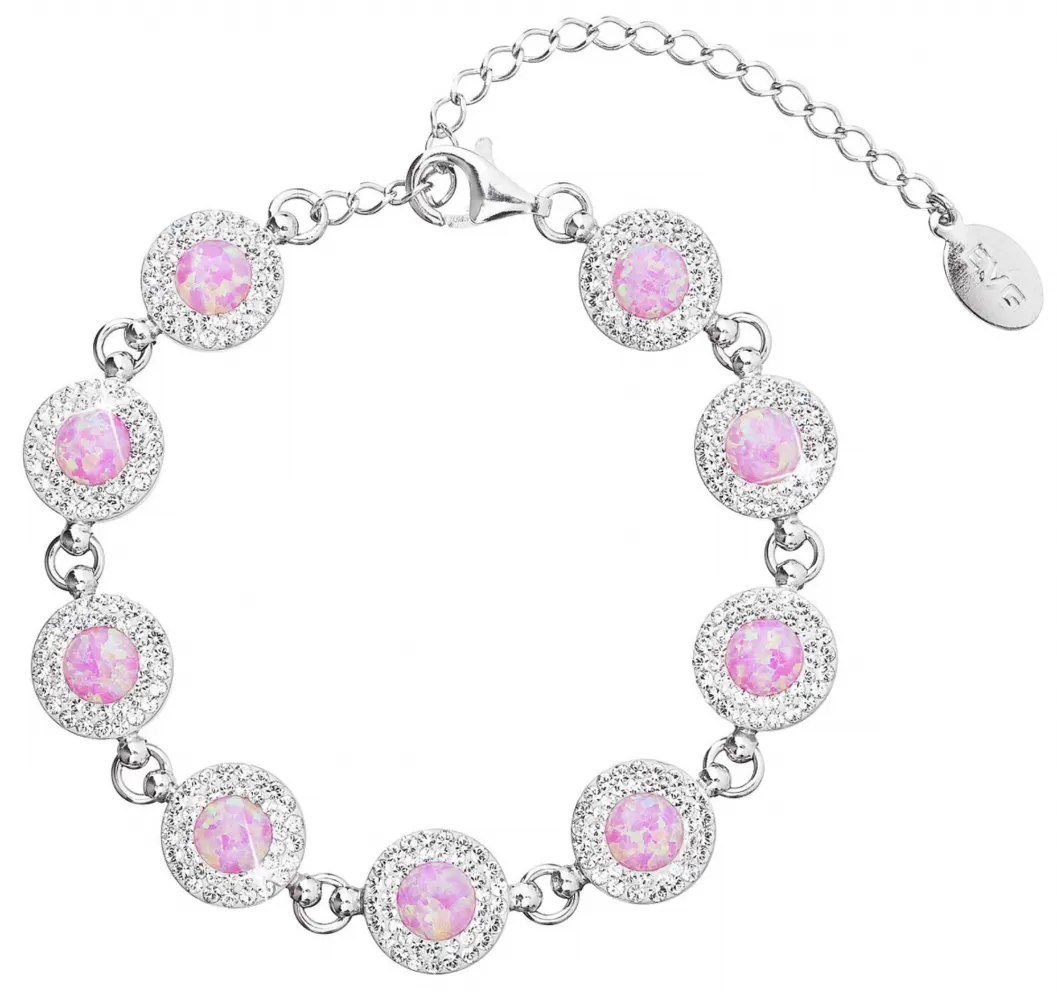 Strieborný náramok 33105.1 je vyrobený zo striebra rýdzosti 925/1000, ktorého povrch bol ošetrený ródiom. Rhodium šperk ochráni proti sčerneniu, zožltnutiu aj poškriabaniu. Náramok je zložený z niekoľkých strieborných koliesok, do ktorých je vsadený ružový syntetický opál. Opál je navyše lemovaný dvoma radmi trblietavých Preciosa kryštálov v bielej farbe. Keďže náramokneobsahuje prídavok niklu, môžu ho bez obáv z alergickej reakcie nosiť aj alergici.
