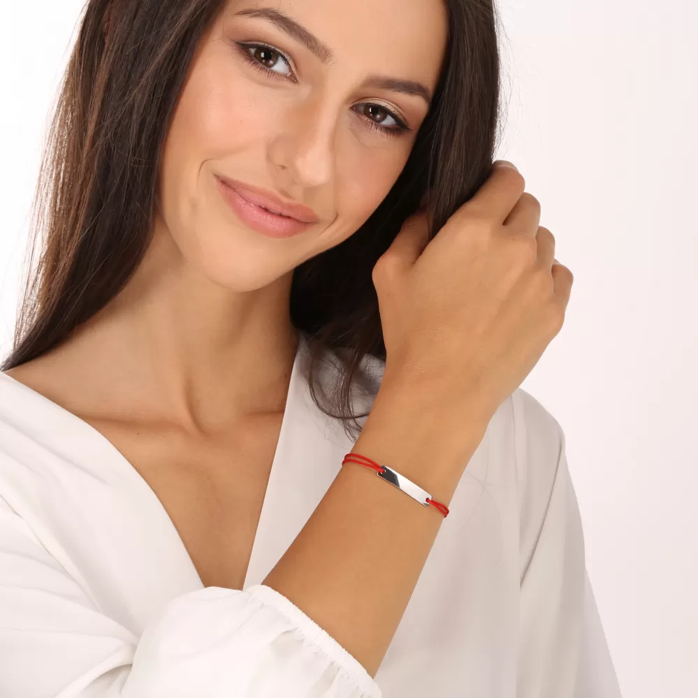 Uprostred náramku sa nachádza lesklý strieborný obdĺžnikový prvok, ktorý upúta svojou jednoduchosťou a eleganciou. Tento prvok je precízne vyrobený z kvalitného striebra rýdzosti 925/1000 vrátane povrchovej úpravy ródiom. Obdĺžnikový tvar symbolizuje stabilitu a rovnováhu, čo pridáva náramku ďalšiu vrstvu významu.