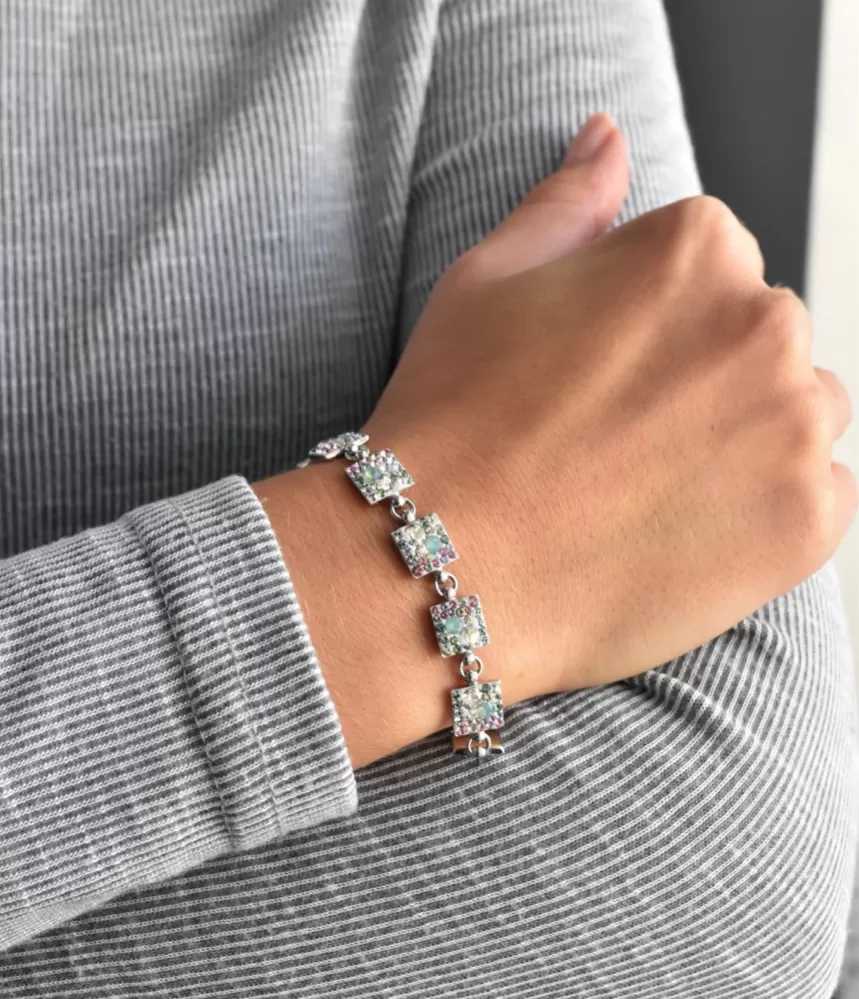 Strieborný náramok 33047.3 sakura je vyrobený zo striebra rýdzosti 925/1000, ktorého povrch bol ošetrený ródiom. Rhodium šperk ochráni proti sčerneniu, zožltnutiu aj poškriabaniu. Náramok je zložený z niekoľkých strieborných štvorčekov, ktoré sú bohato vysadené Swarovski kryštálmi v rôznych farbách. Keďže náramokneobsahuje prídavok niklu, môžu ho bez obáv z alergickej reakcie nosiť aj alergici.