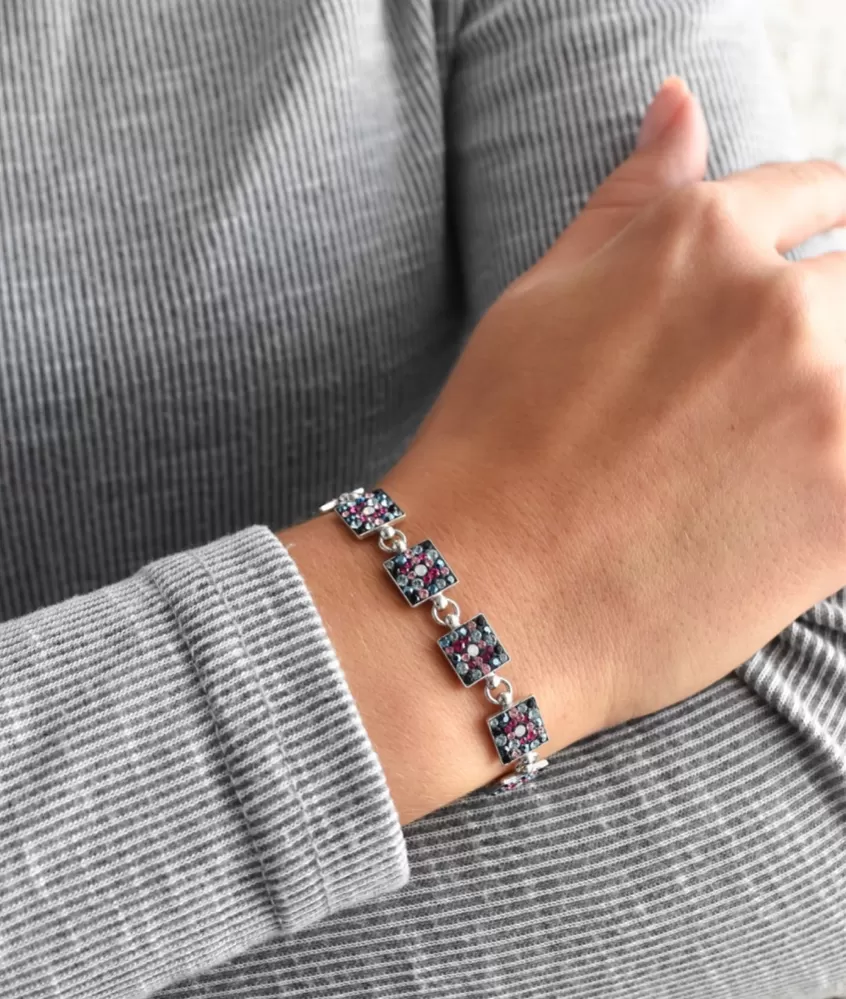 Strieborný náramok 33047.4 galaxy je vyrobený zo striebra rýdzosti 925/1000, ktorého povrch bol ošetrený ródiom. Rhodium šperk ochráni proti sčerneniu, zožltnutiu aj poškriabaniu. Náramok je zložený z niekoľkých strieborných štvorčekov, ktoré sú bohato vysadené Swarovski kryštálmi v rôznych farbách. Keďže náramokneobsahuje prídavok niklu, môžu ho bez obáv z alergickej reakcie nosiť aj alergici.
