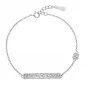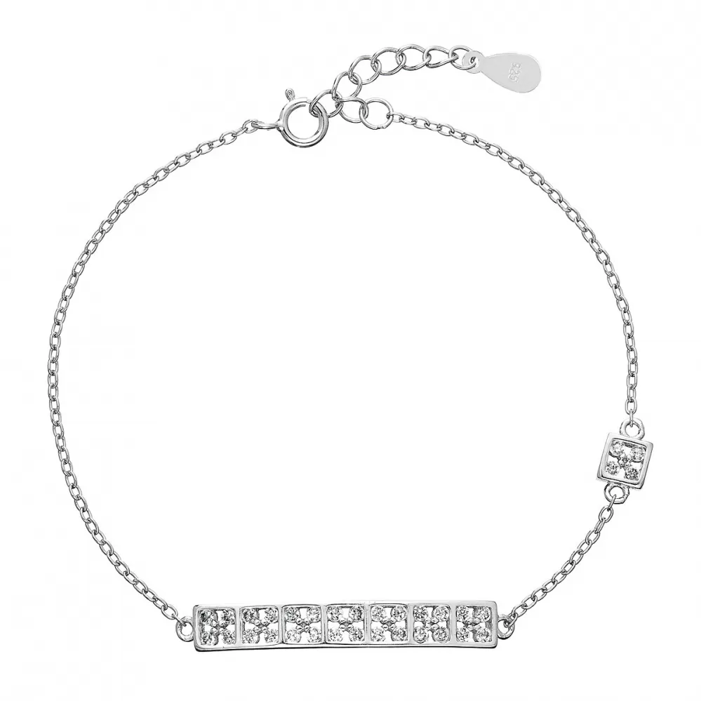 Náramok 13014.1 vyrábame zo striebra rýdzosti 925/1000, ktorého povrch ošetrujeme ródiom. Rhodium šperk ochráni proti sčerneniu, zožltnutiu aj poškriabaniu. Náramok zdobí jemná retiazka, jeden štvorec so zirkónmi a tiež rovná čiara, ktorú tvorí 7 okienok so zirkónmi.