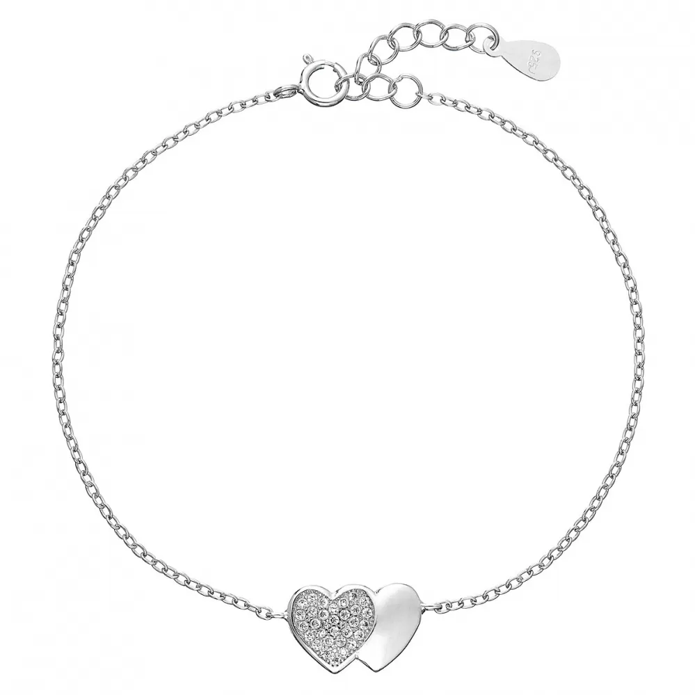 Náramok dve srdcia 13010.1 vyrábame zo striebra rýdzosti 925/1000, ktorého povrch ošetrujeme ródiom. kde jedno je osadené bielymi zirkónmi.