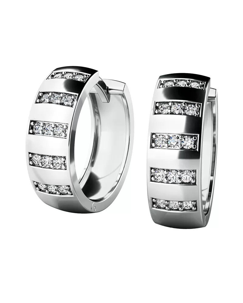 Náušnice kruhy patří mezi vůbec nejoblíbenější typ náušnic, náušnice jsou vhodné pro každodenní nošení i na společenské akce a sluší každé ženě! Tyto elegantní kruhy jsou vyrobeny z bílého čtrnáctikarátového zlata - 585/1000 v lesklé povrchové úpravě a s mírně půlkulatou horní plochou. V náušnicích je vsazeno třicet kulatých zirkonů v briliantovém brusu, díky kterému dokonale odráží světlo a neuvěřitelné září. Vsazování zirkonů provádějí naši nejzkušenější mistři zlatníci ručně pod mikroskopem s přesností na 0,01mm a proto nehrozí vypadnutí kamínků jako to bývá u strojně vyráběných náušnic. Na náušnicích se "nešetřilo zlatem", proto jsou pevné a snesou i hrubší zacházení