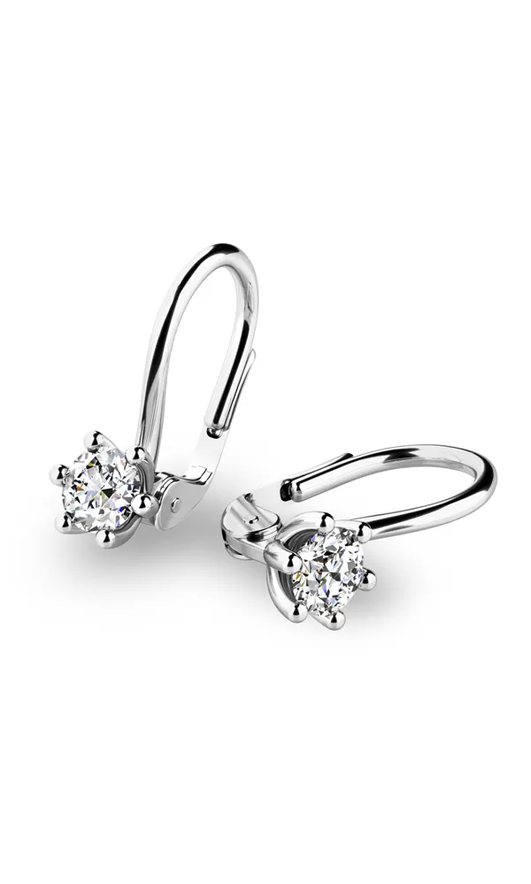Tieto nádherné, žiarivé náušnice sú vyrobené z bieleho štrnásťkarátového zlata - 585/1000 v lesklej povrchovej úprave. Visiace náušnice sú zdobené jedným zirkónom briliantového brusu, ktorý je vsadený do náušníc a obklopený šiestimi krapnami. Vďaka precíznemu brúsu zirkóny získajú dokonalú brilanciu. Skvele odráža svetlo a september. Zapínanie náušníc je na klapku.