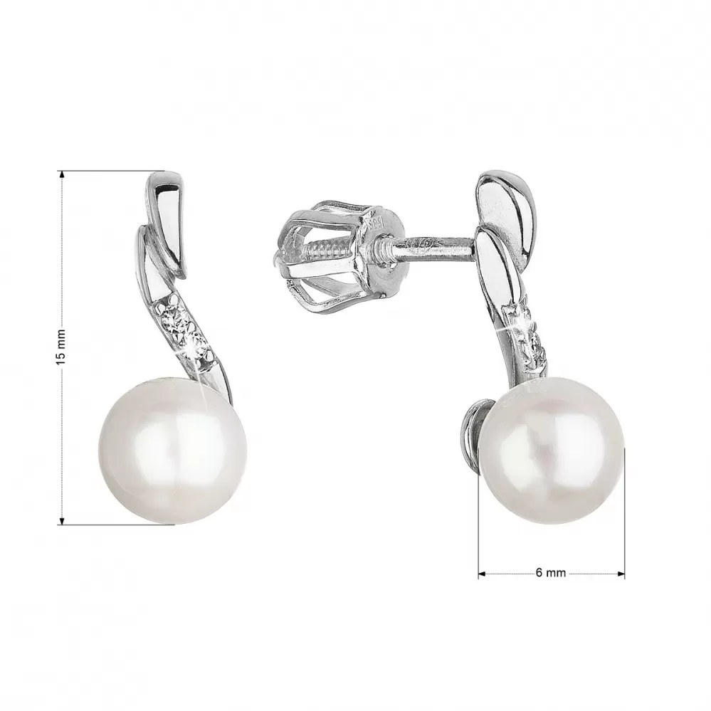 Náušnice  81PZ00027 sú vyrobené zo 14-karátového bieleho zlata s rýdzosťou 585/1000 ľahko prizdobené zirkónmi s krásnou a guľatou riečnou perlou. Šírka perličky je 6-6,5 mm.  Náušnice majú zapínanie na skrutku.