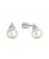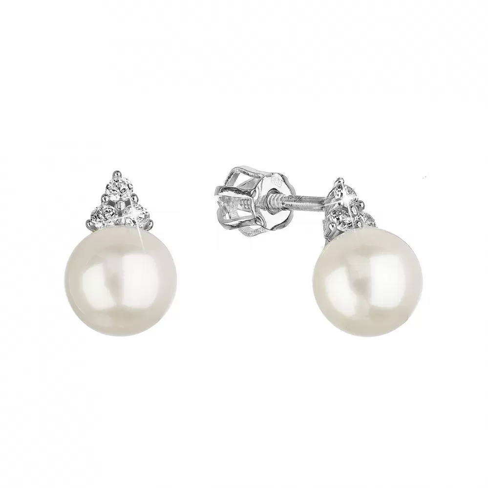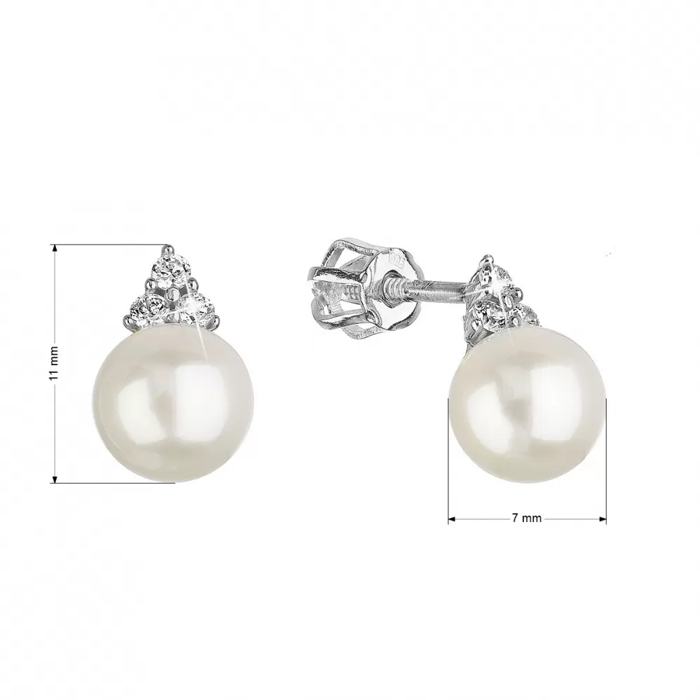 Náušnice 81PZ00025 sú vyrobené zo 14-karátového bieleho zlata s rýdzosťou 585/1000 a zdobia ich okrúhle biele riečne perly tej najvyššej kvality AAA. /strong> Šírka perličky je 7-7,5 mm. Nad perličkou sú malé tri zirkóny, ktoré pomáhajú upútať pozornosť k perličke svojím septembrom. Náušnice typu pecka majú zapínanie na skrutku.