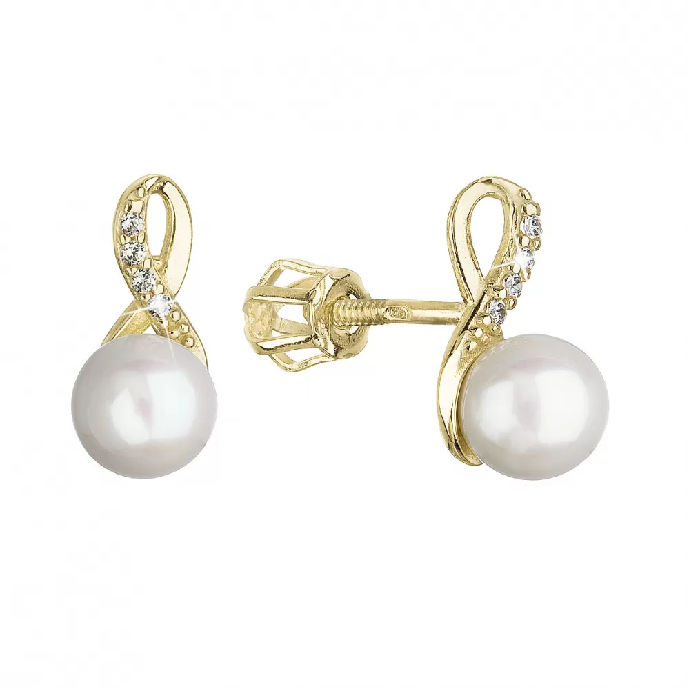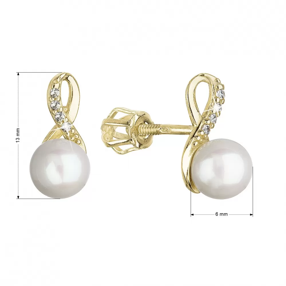 Zlaté 14 karátové náušnice žlté zlato s bielou riečnou perlou a zirkónmi 91PZ00028 nekonečno