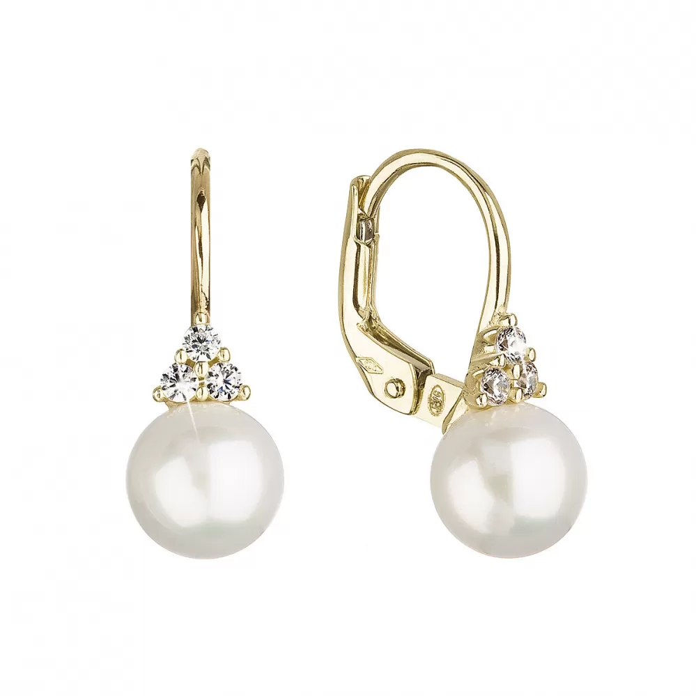 Zlaté 14 karátové náušnice žlté zlato s bielou riečnou perlou a tromi zirkónmi 91PZ00024