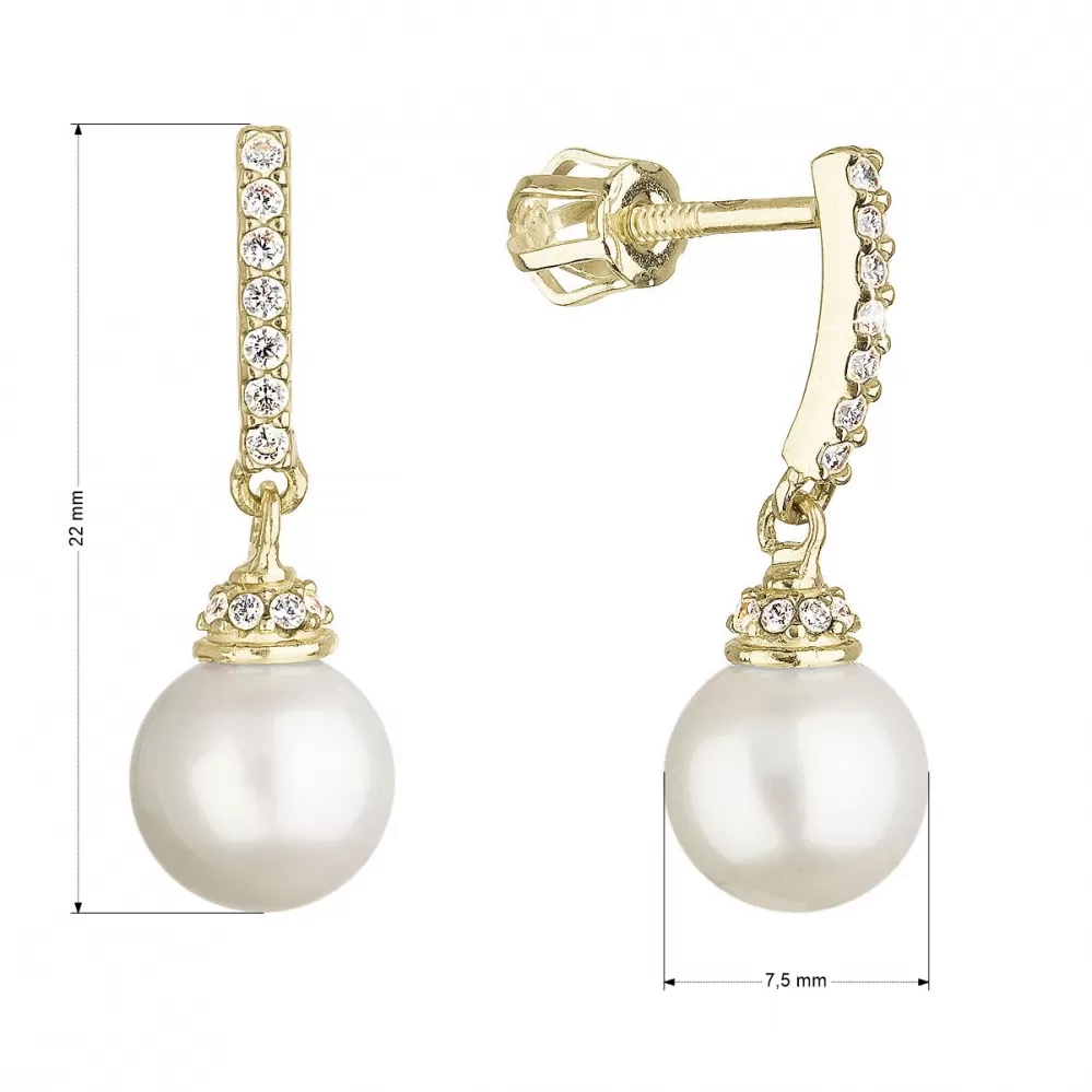 Nádherné visiacezlaté náušnice s guľatou riečnou perlou zdobené zirkónmi zaujmú pohľady všetkých.