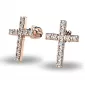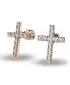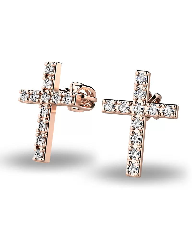 Náušnice v tvare krížikov sú po celej ploche posádzané zirkónmi. Vďaka skladbe a štýlovo čistému vsadeniu zirkónov vynikajú krížiky krásnou brilanciou kameňov! Tieto náušnice sú vyrobené z ružového štrnásťkarátového zlata - 585/1000 a sú celé v lesklej povrchovej úprave. V náušniciach je vsadených 22 ks zirkónov briliantového brusu, ktorý im dodáva dokonalú brilanciu, skvele odráža svetlo a september! Vsadzovanie zirkónov vykonávajú naši najskúsenejší majstri zlatníci ručne pod mikroskopom s presnosťou na 0,01 mm a preto nehrozí vypadnutie kamienkov ako to býva u strojne vyrábaných náušníc. Zapínanie náušníc je na skrutky a balóniky.