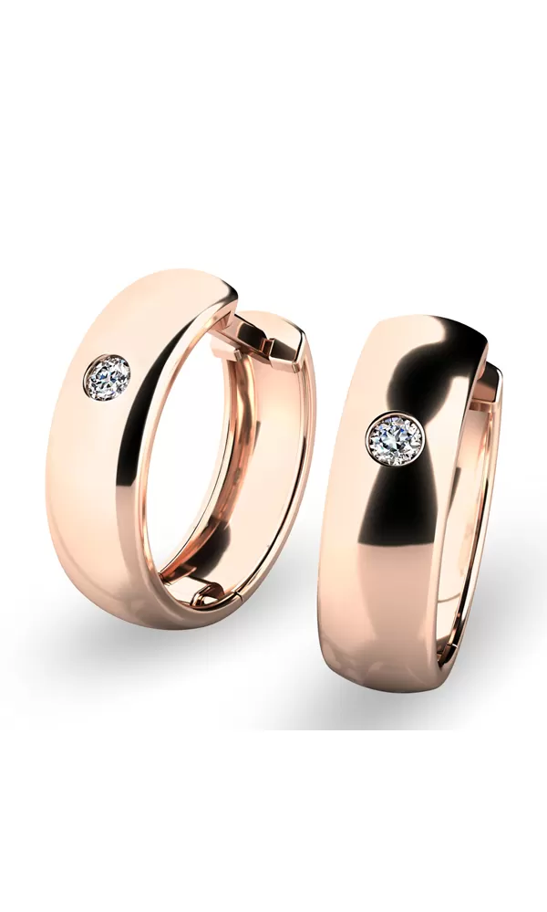 Náušnice kruhy patří mezi vůbec nejoblíbenější typ náušnic, náušnice jsou vhodné pro každodenní nošení i na společenské akce a sluší každé ženě! Tyto elegantní kruhy jsou vyrobeny z růžového čtrnáctikarátového zlata - 585/1000 v lesklé povrchové úpravě a s mírně půlkulatou horní plochou. V náušnicích jsou vsazeny dva kulaté zirkony. Zirkony mají briliantový brus Signity star, který zajišťuje maximální brilanci kamenů. Díky skladbě a stylově čistému vsazení zirkonů, náušnice vynikají krásnou brilancí kamenů. Vsazování zirkonů do náušnic provádějí naši nejzkušenější mistři zlatníci ručně pod mikroskopem s přesností na 0,01mm a proto nehrozí vypadnutí kamínků jako to bývá u strojně vyráběných náušnic.