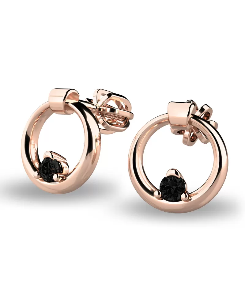 Náušnice sú čistého dizajnu v modernom prevedení, ktoré patria k najobľúbenejším typom. Tieto náušnice sú vyrobené z ružového štrnásťkarátového zlata - 585/1000 a sú celé v lesklej povrchovej úprave. Náušnice sú zdobené dvoma čiernymi zirkónmi briliantového brusu. Vsadzovanie zirkónov vykonávajú naši najskúsenejší majstri zlatníci ručne pod mikroskopom s presnosťou na 0,01 mm a preto nehrozí vypadnutie kamienkov ako to býva u strojne vyrábaných náušníc. Zapínanie náušníc je na skrutky a balóniky.