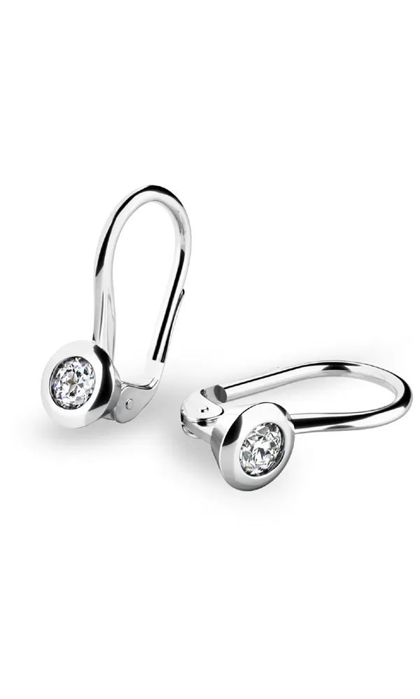Dlhoveký model klasických náušníc zdobia dva väčšie oslňujúce zirkóny briliantového brusu. Tieto žiarivé náušnice sú vyrobené z bieleho štrnásťkarátového zlata - 585/1000 v lesklej povrchovej úprave. Zirkóny sú vsadené "na hladko" uprostred okrúhle lesklej obruby a opticky ich zväčšuje lesklý lem okolo zirkónov. Vďaka precíznemu brúsu zirkóny získali dokonalú brilanciu. Skvele odráža svetlo a september! Náušnice sa vyrábajú aj v žltom zlate a zapínajú sa na klapku.