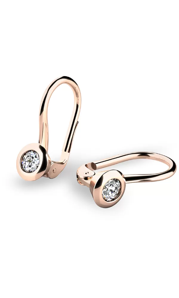 Dlhoveký model klasických náušníc zdobia dva väčšie oslňujúce zirkóny briliantového brusu. Tieto žiarivé náušnice sú vyrobené z ružového štrnásťkarátového zlata - 585/1000 v lesklej povrchovej úprave. Zirkóny sú vsadené "na hladko" uprostred okrúhle lesklej obruby a opticky ich zväčšuje lesklý lem okolo zirkónov. Vďaka precíznemu brúsu zirkóny získali dokonalú brilanciu. Skvele odráža svetlo a september! Náušnice sa vyrábajú aj v bielom aj žltom zlate a zapínajú sa na klapku.