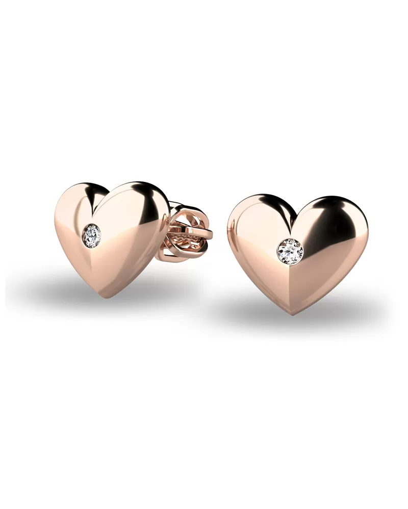 Náušnice "pecky" v tvare srdiečok tzn. že náušnice sú priamo na uchu, patria stále medzi najobľúbenejšie typy náušníc. Sú vyrobené z ružového štrnásťkarátového zlata - 585/1000 a sú celé v lesklej povrchovej úprave. V každej náušnici je vsadený jeden okrúhly zirkón briliantového brusu, ktorý im dodáva dokonalú brilanciu, skvele odráža svetlo a september! Vsadzovanie zirkónov vykonávajú naši najskúsenejší majstri zlatníci ručne pod mikroskopom s presnosťou na 0,01 mm a preto nehrozí vypadnutie kamienkov ako to býva u strojne vyrábaných náušníc. Zapínanie náušníc je na skrutky a balóniky.