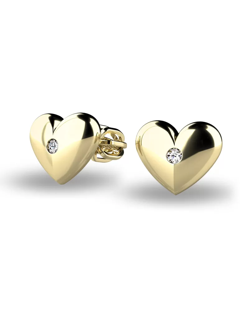Náušnice "pecky" v tvare srdiečok tzn. že náušnice sú priamo na uchu, patria stále medzi najobľúbenejšie typy náušníc. Sú vyrobené zo žltého štrnásťkarátového zlata - 585/1000 a sú celé v lesklej povrchovej úprave. V každej náušnici je vsadený jeden okrúhly zirkón briliantového brusu, ktorý im dodáva dokonalú brilanciu, skvele odráža svetlo a september! Vsadzovanie zirkónov vykonávajú naši najskúsenejší majstri zlatníci ručne pod mikroskopom s presnosťou na 0,01 mm a preto nehrozí vypadnutie kamienkov ako to býva u strojne vyrábaných náušníc. Zapínanie náušníc je na skrutky a balóniky.