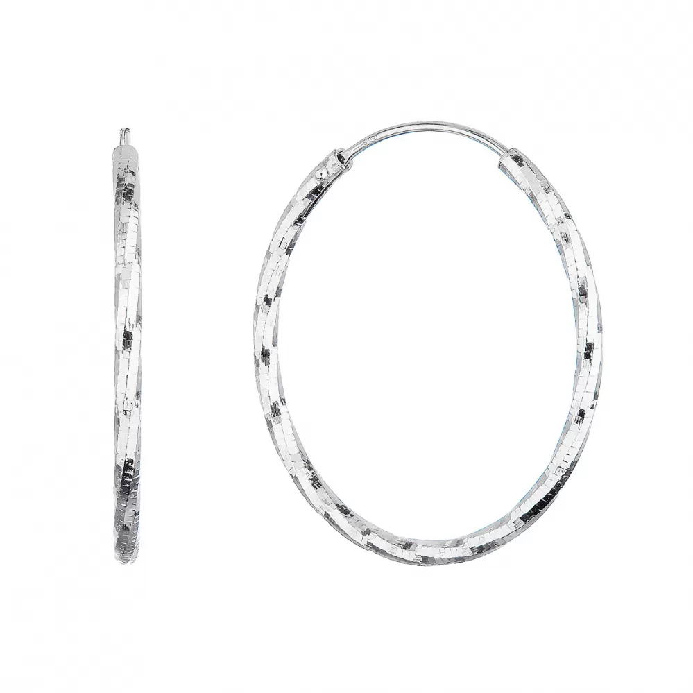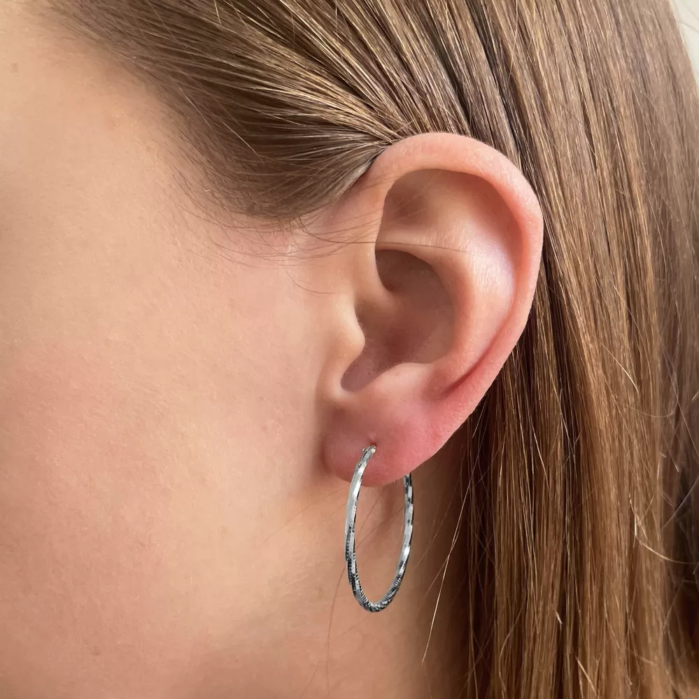 Strieborné náušnice typu kruhy s ozdobným prelisovaním61007 sú vyrobenézo striebra rýdzosti 925/1000, ktorého povrch je upravený ródiom. Rhodium šperk ochráni proti sčerneniu, zožltnutiu alebo poškriabaniu.