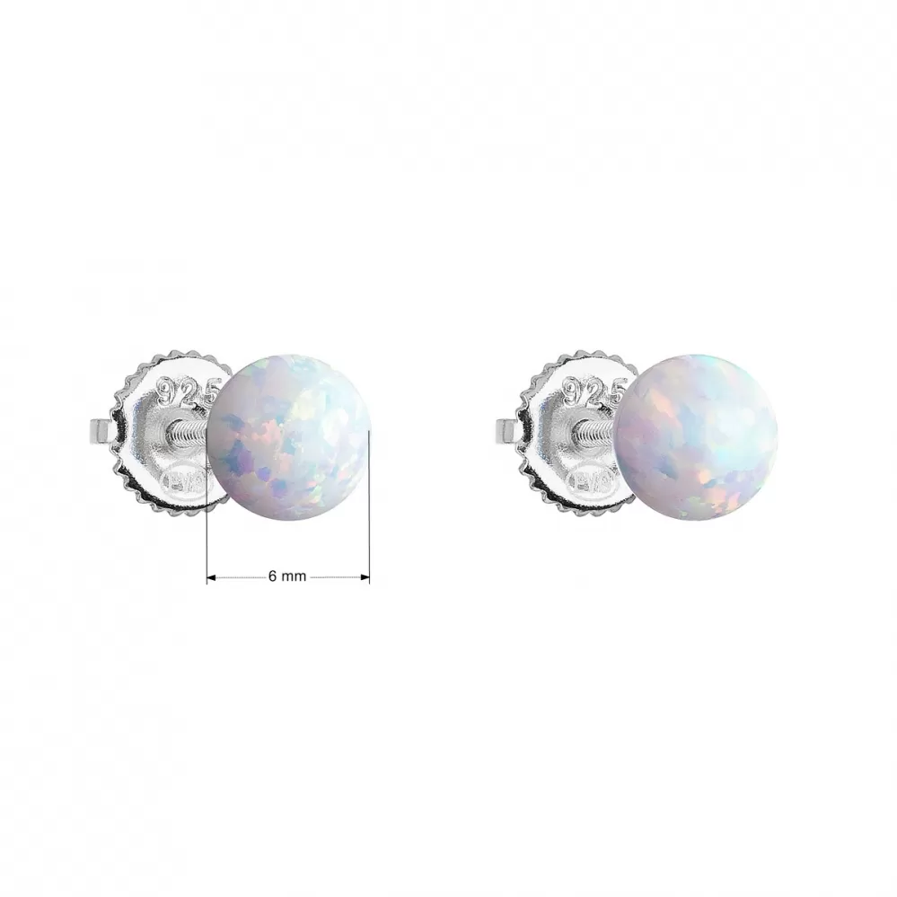 Okrúhle kôstky náušnice tvoríme zo striebra rýdzosti 925/1000, ktoré je upravené ródiom. Vďaka ródiu je šperkodolný proti sčernaniu, zožltnutiu alebo poškriabaniu. Náušnice tvoria jeden okrúhly syntetický opál v bielej farbe.