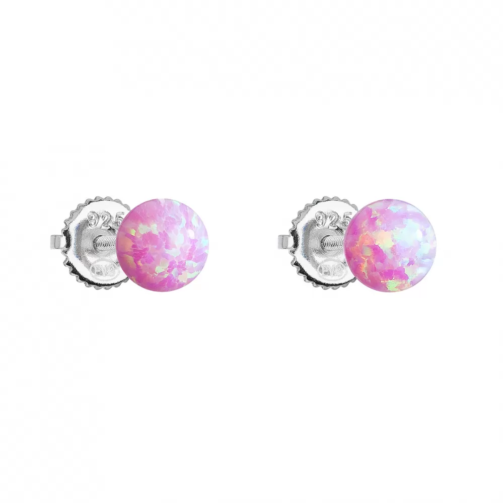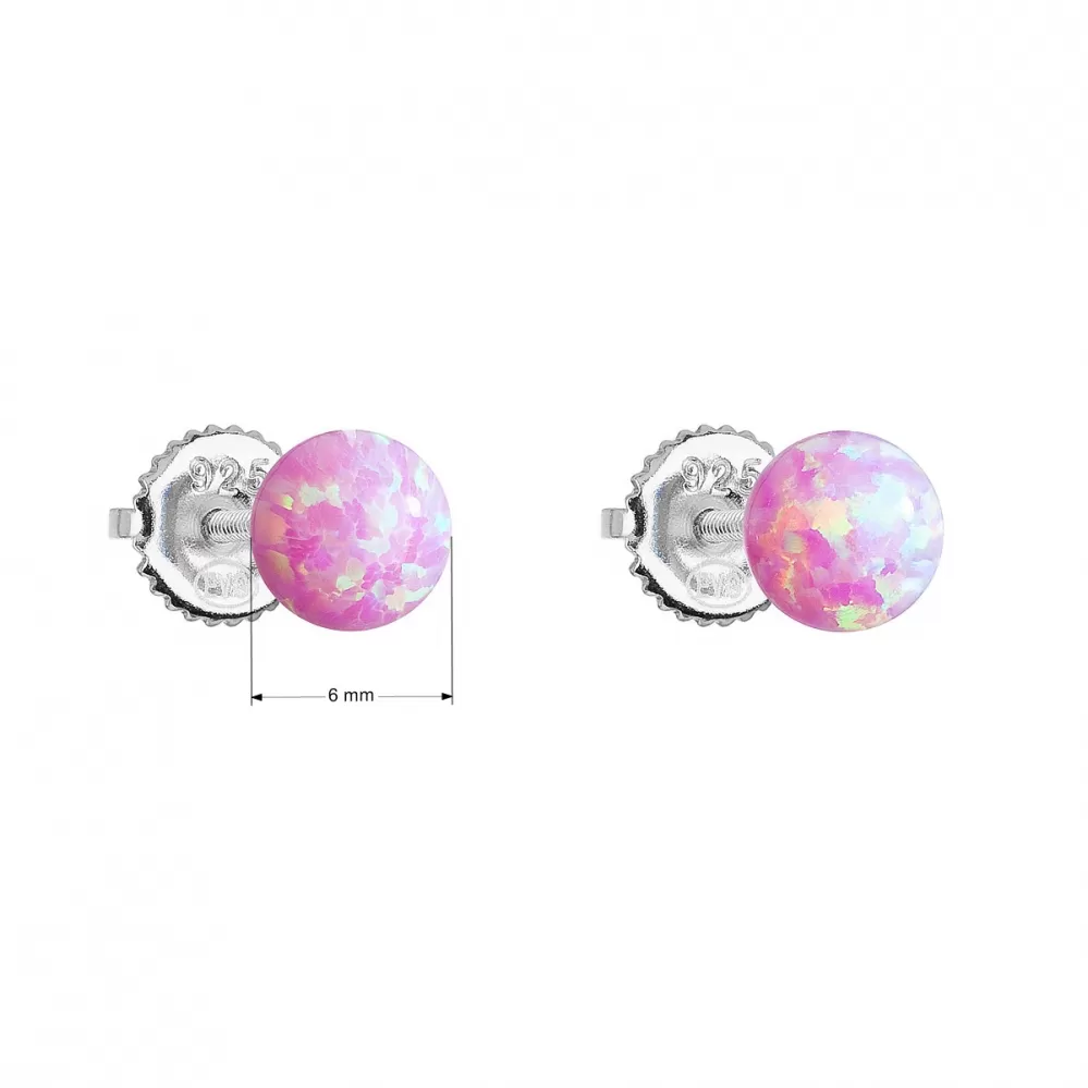 Okrúhle kôstky náušnice tvoríme zo striebra rýdzosti 925/1000, ktoré je upravené ródiom. Vďaka ródiu je šperkodolný proti sčernaniu, zožltnutiu alebo poškriabaniu. Náušnice tvoria jeden okrúhly syntetický opál v ružovej farbe.