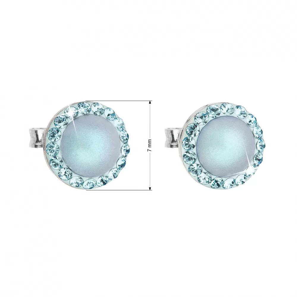 Strieborné náušnice pecka s kryštálmi Swarovski a svetlo modrou matnou perlou okrúhle 31214.3