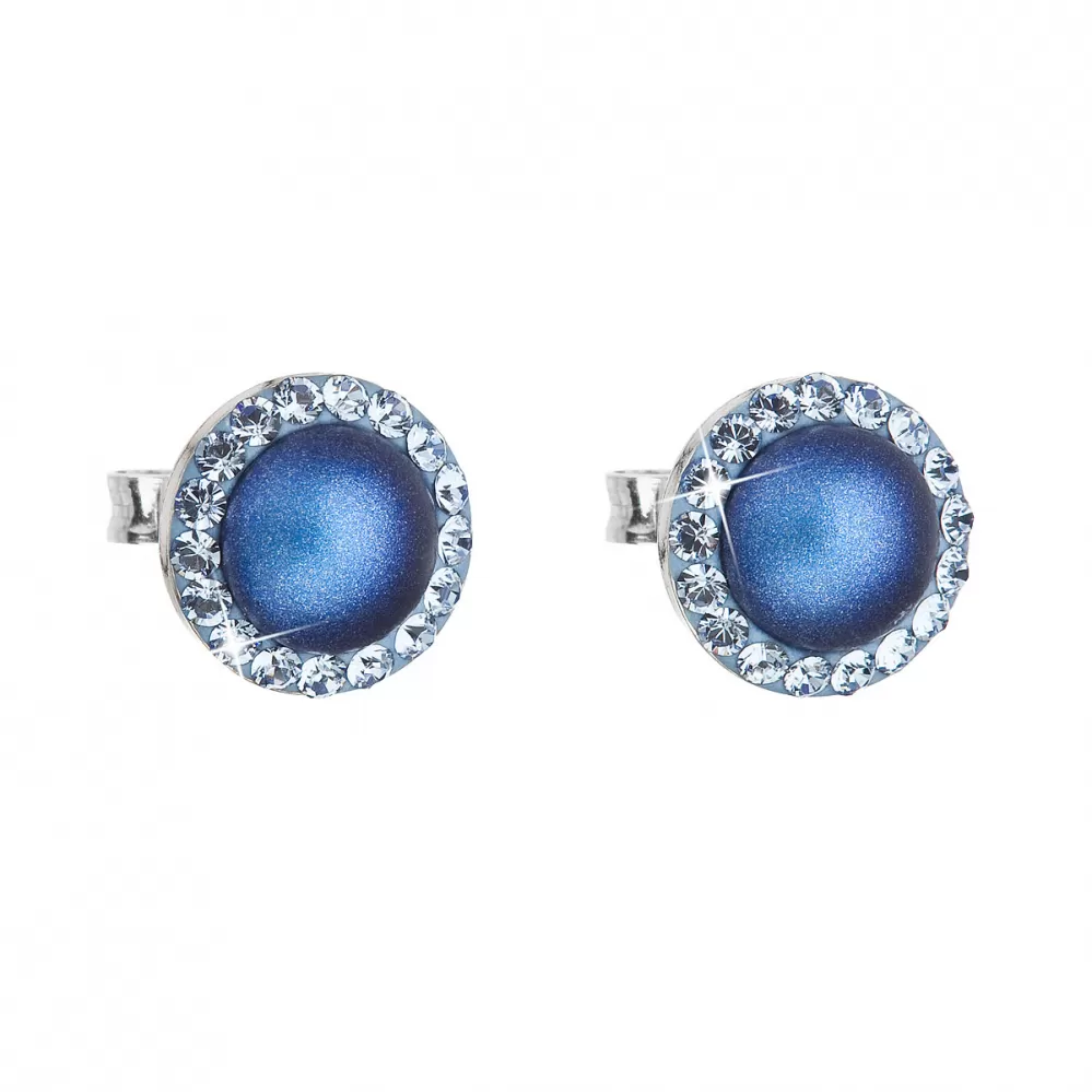 Strieborné náušnice pecka s kryštálmi Swarovski a tmavomodrou matnou perlou okrúhle 31214.3