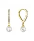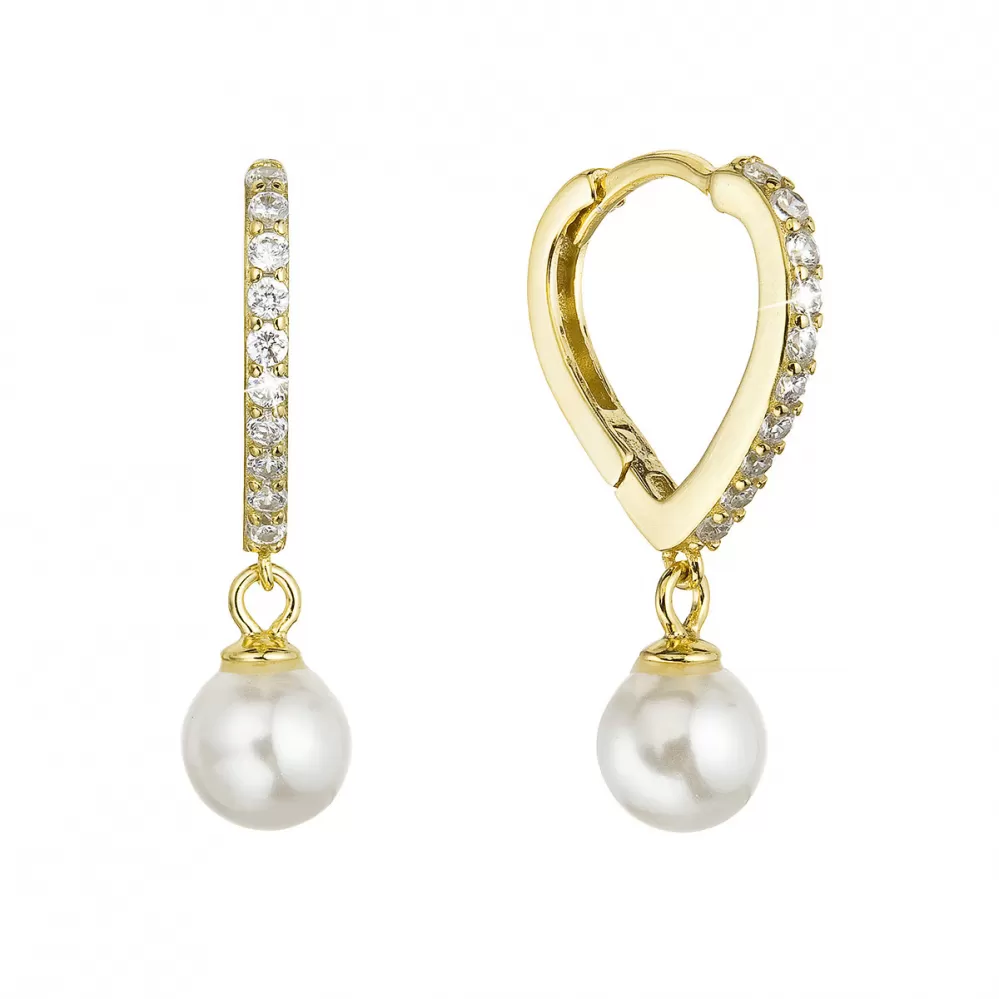 Pozlátené strieborné náušnice srdca so zirkónmi a visiacou perličkou shell 11426.1