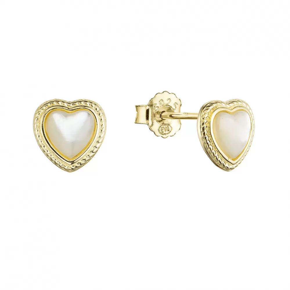 Romantické srdiečkové náušnice zdobené bielou perleťou pristanú každej nežnej duši.  Náušnice typu kôstky 11433.1 sú vyrobené z pozláteného striebra… Celý popis