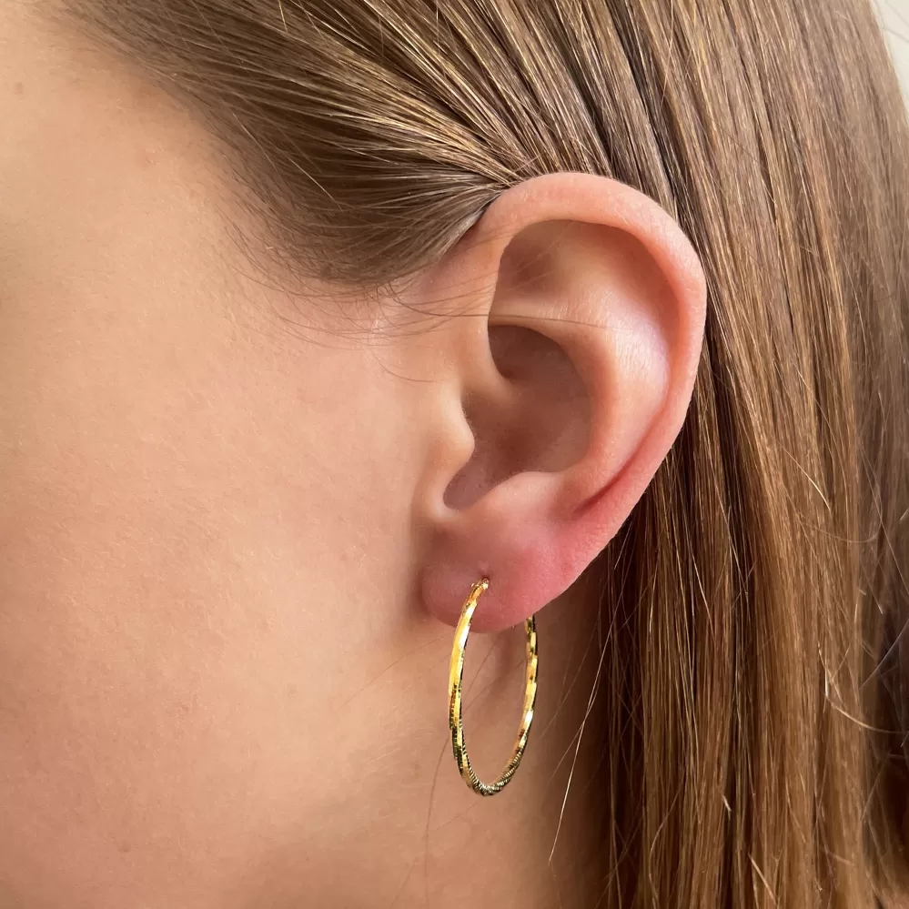 Pozlátené strieborné náušnice typu kruhy s ozdobným prelisovaním 61007 sú vyrobené zo striebra rýdzosti 925/1000. Náušnice majú dĺžku 30 mm a zapínanie na krúžok. Šperk 61007 neobsahuje nikel, a tak sa nemusíte obávať alergickej reakcie.