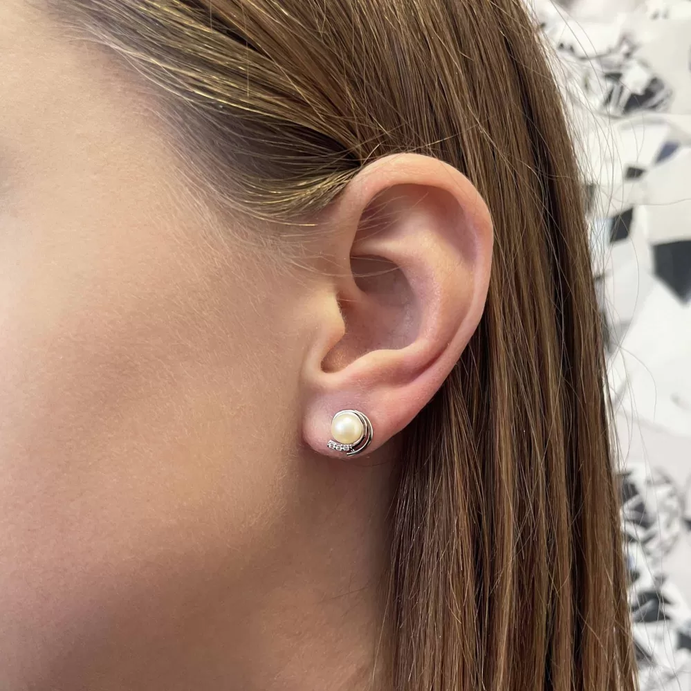 Strieborné náušnice s bielou riečnou perlou a trblietavými zirkónmi v tvare rotujúceho vieru, sú rozverným doplnkom.