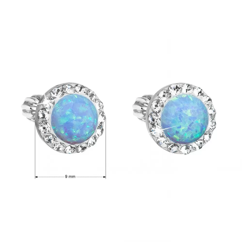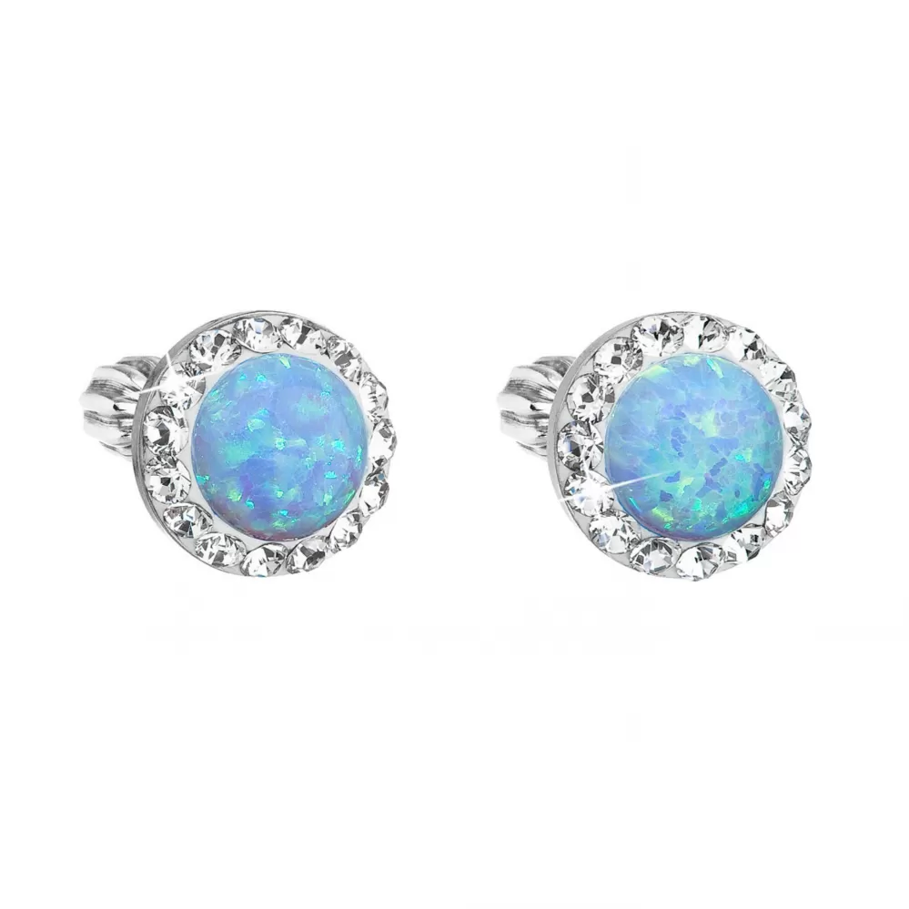 Strieborné náušnice kôstky so syntetickým opálom a Preciosa kryštály svetlo modré okrúhle 31317.1