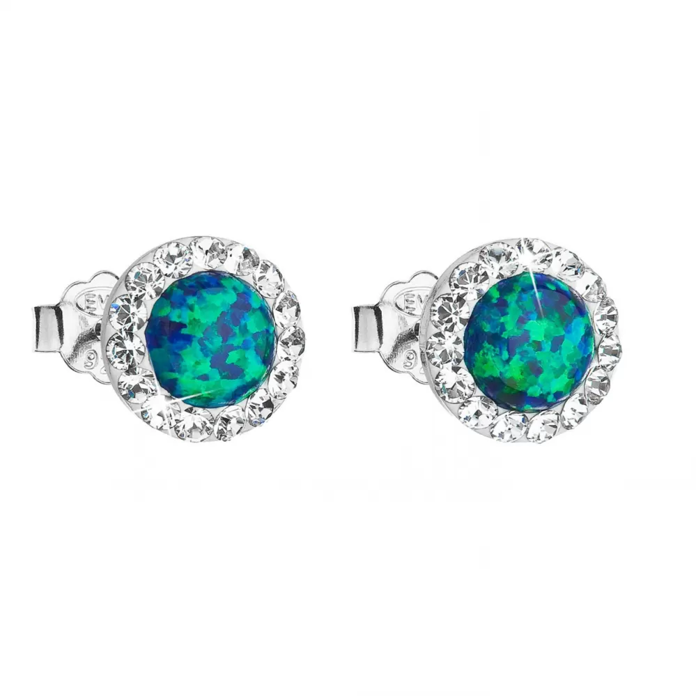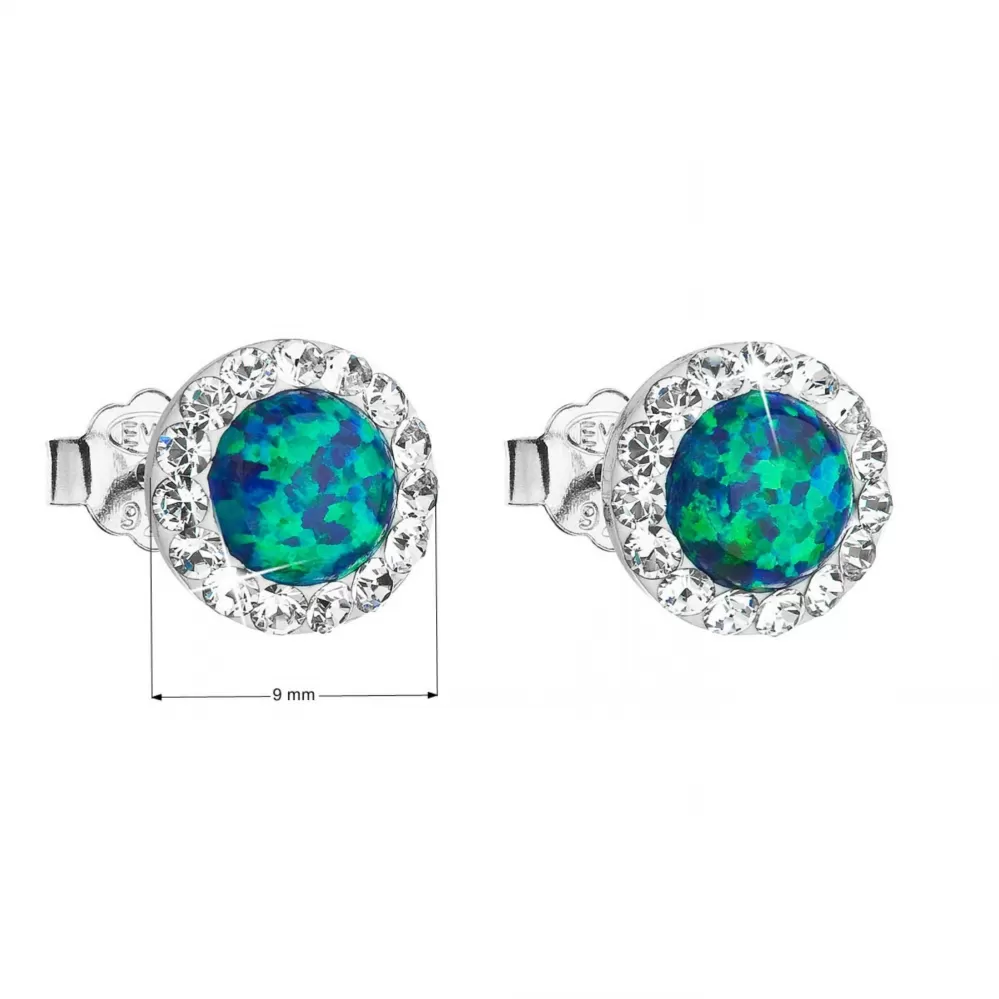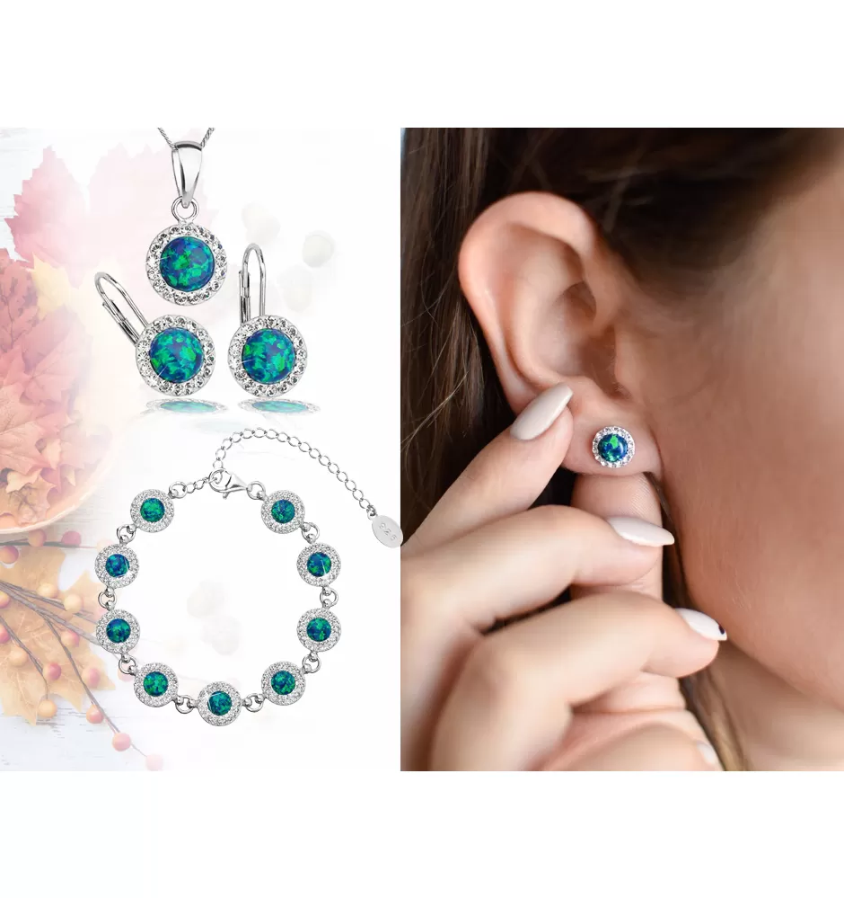 Náušnice typu kôstky 31217.1 sú vyrobené zo striebra rýdzosti 925/1000 vrátane povrchovej úpravy ródiom a je do nich zasadený okrúhly syntetický opál zdobený niekoľkými odtieňmi zelenej farby. Opál sa krásne trbliece a hádže rôzne farebné odlesky. Po obvode sú naviac okrúhle náušnice vysadené bielymi Preciosa kryštáliky. Náušnice sa zapínajú na puzetu, ktorá ich spoľahlivo ochráni proti ich strate. Keďže do šperku nie je pridaný žiadny nikel, môžu ich s radosťou nosiť aj alergici.