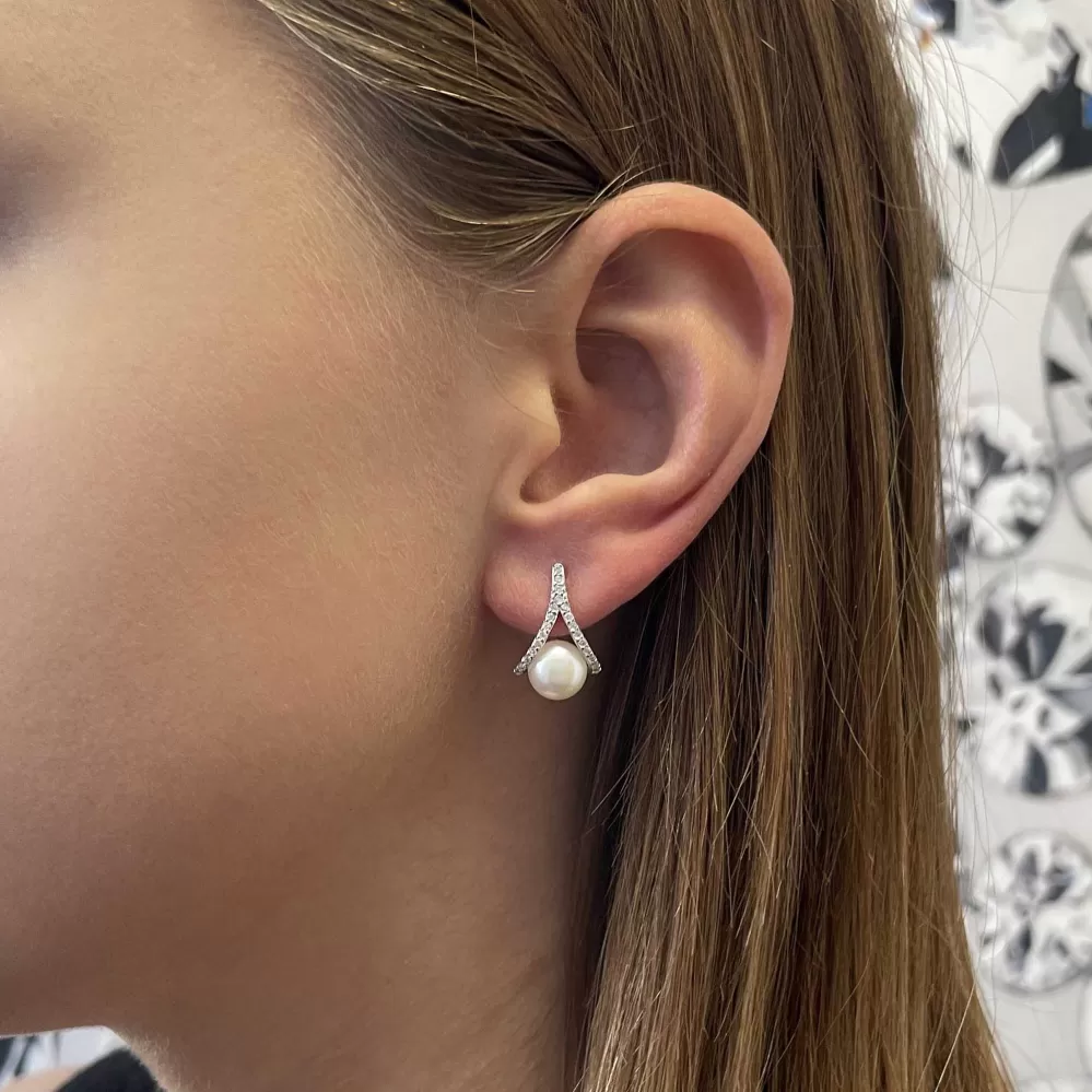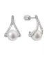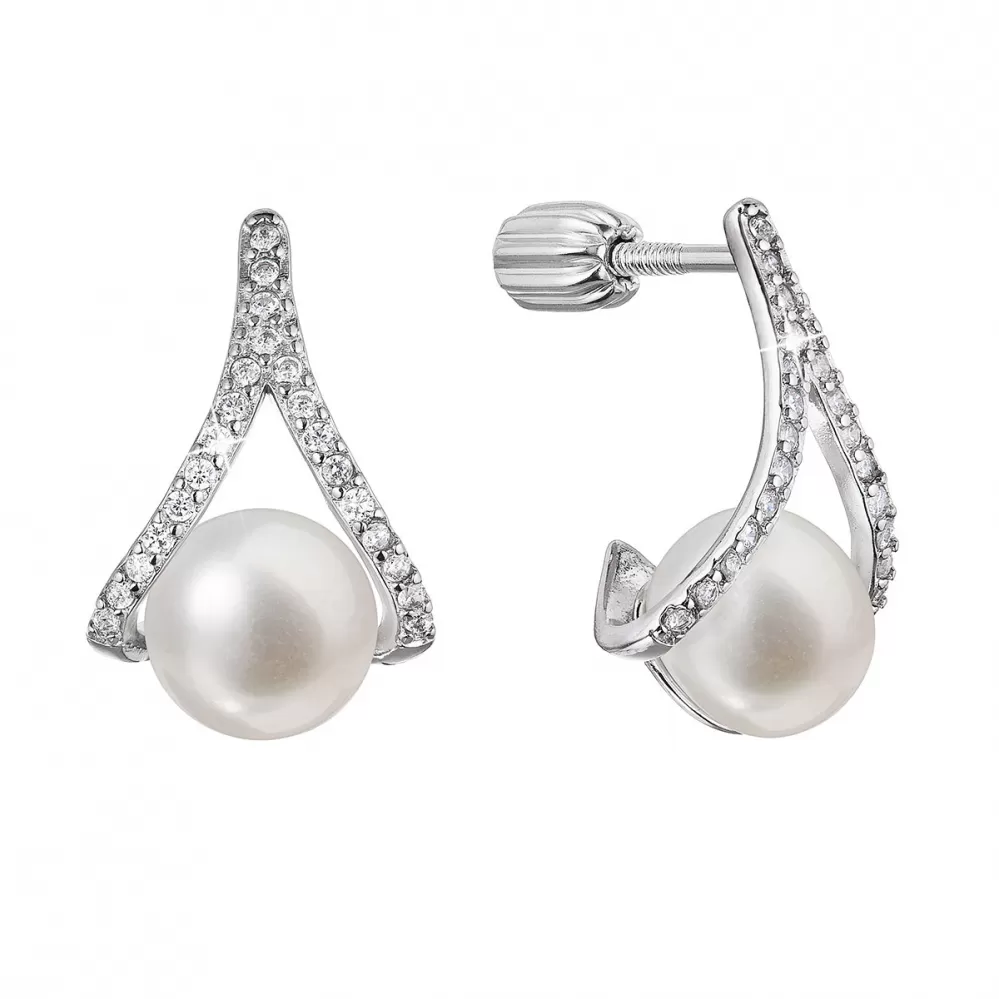 Strieborné náušnice s bielou riečnou perlou a trblietavými zirkónmi sú elegantným doplnkom.