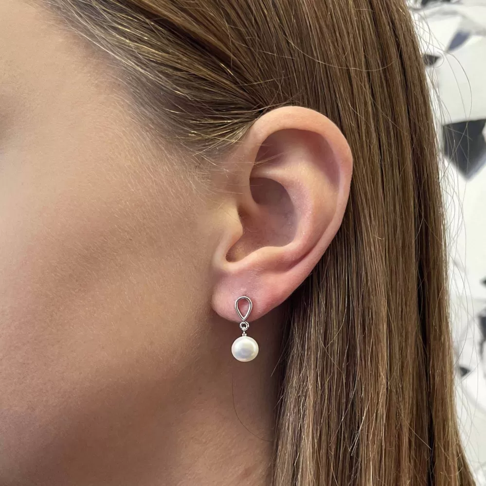 Strieborné visiace náušnice s voľne sa pohupujúcou bielou riečnou perlou na Vás upútajú pozornosť.