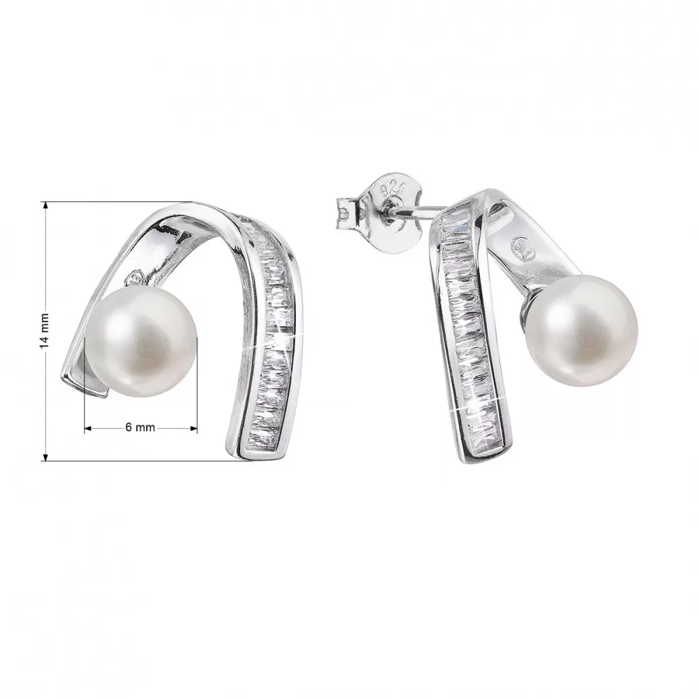 Strieborné náušnice visiace s bielou riečnou perlou a zirkónmi 21074.1