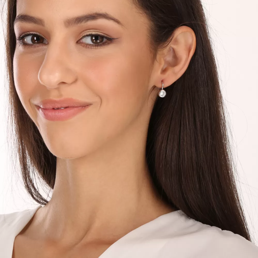 Jednoduché strieborné náušnice s krásnym zirkónom vsadeným v striebre a zapínaním na klapku predstavujú perfektnú kombináciu elegancie a praktickosti.