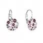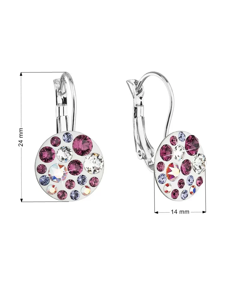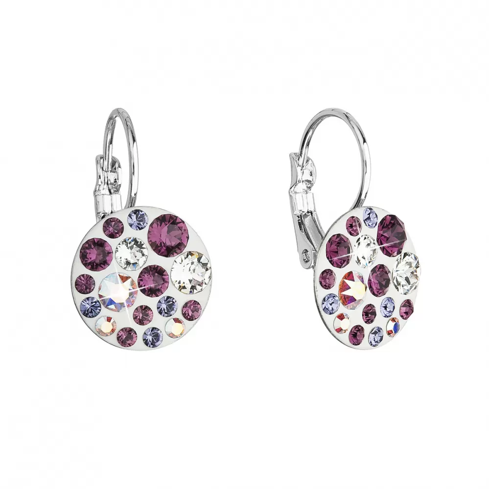 Okrúhle bižutérne náušnice 51035.3 majú dĺžku 24 mm a zdobia ich niekoľko Swarovski kryštálov v bielej a fialovej farbe. Náušnice sa zapínajú na klapku, ktorá ich spoľahlivo ochráni proti nechcenej strate.