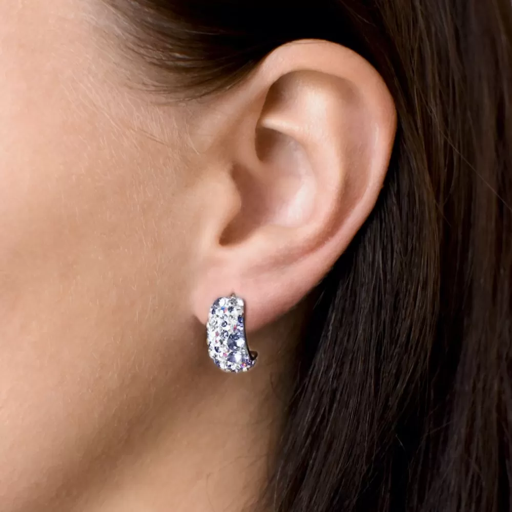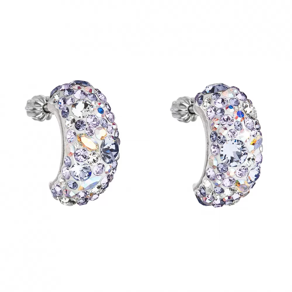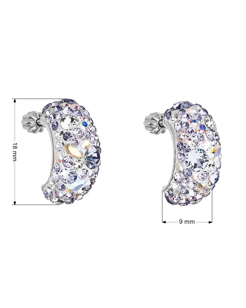 Dámske náušnice 31164.3 v tvare polkruhu sú vyrobené zo striebra o rýdzosti 925/1000 s povrchovou úpravou ródiom a sú zdobené mnohými Swarovski fialové v odtieňoch. Vďaka Swarovski kryštálom sa náušnice nádherne trblietajú. Náušnice zapnete  na balónik, ktorý ich spoľahlivo ochráni proti nechcenej strate. Keďže do náušnícnie je pridaný nikel, môžu ich bez obáv nosiť aj alergici.
