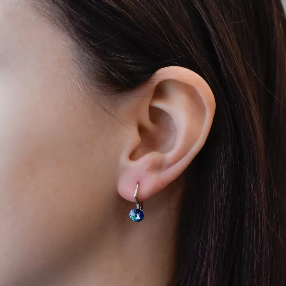 Náušnice sú vyrobené zo striebra o rýdzosti 925/1000 s povrchovou úpravou ródiom a sú zdobené 6 mm širokým okrúhlym Swarovski kryštálom v modrej farbe. Náušnice zapnete na klapku, ktorá ich spoľahlivo ochráni proti nechcenej strate. Do náušnícnie je pridaný nikel, a tak ich bez obáv môžu nosiť aj alergici.