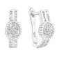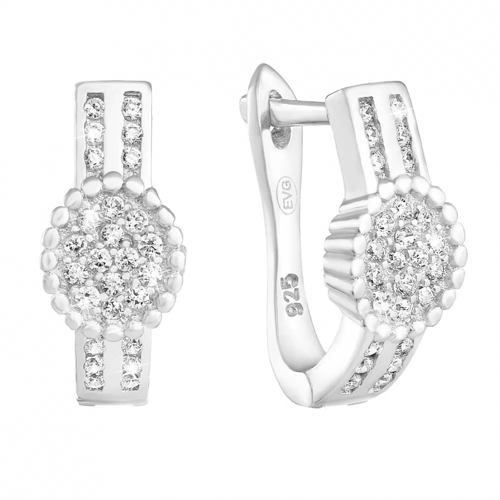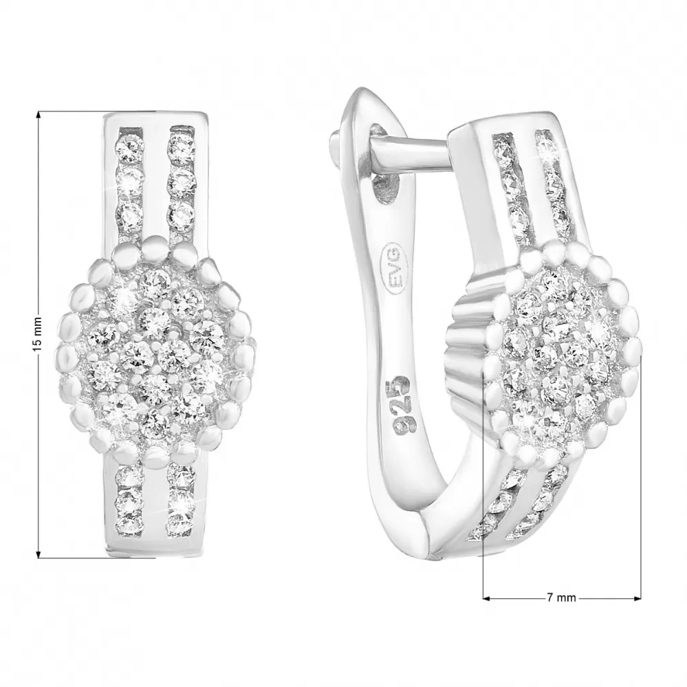 Visiace náušnice 11234.1 sú vyrobené z striebra rýdzosti 925/1000, ktorého povrch upravujeme ródiom. Ródium šperk ochráni proti nepekným zmenám vzhľadu - sčernanie, zožltnutie alebo poškriabaniu. Náušnice majú dĺžku 15 mm. Náušnice tvoria ovál, ktorý je vo vnútri zdobený malými bielymi zirkónmi, z neho vychádzajú dva pruhy drobných zirkónov.