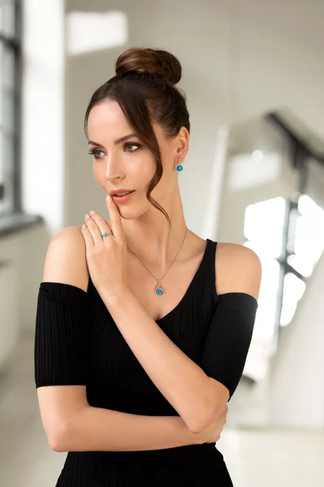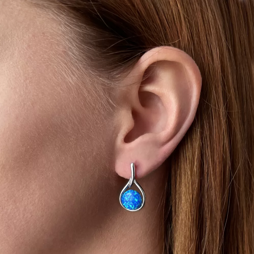 Visiace náušnice tvoríme zo striebra rýdzosti 925/1000, ktoré je na povrchu upravené ródiom. Vďaka ródiu je šperk odolný proti sčernaniu, zožltnutiu alebo poškriabaniu. Náušnice tvoria jeden okrúhly syntetický opál v modrej farbe, ktorý je zasadený do striebornej kvapky.