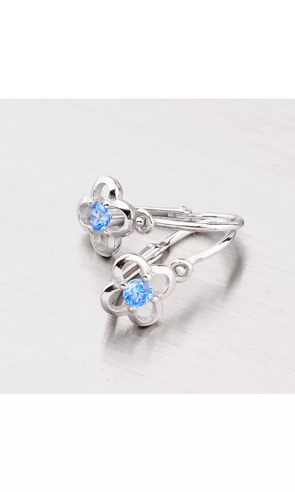 Detské náušnice v tvare kvietky sú vyrobené z bieleho štrnásťkarátového zlata 585/1000 v lesklej povrchovej úprave s jedným zirkónom modrej farby. Náušničky sa zapínajú na brizúry.
