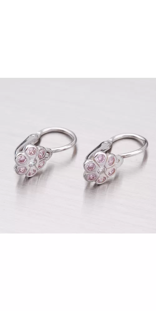 Detské náušnice v tvare kvietky vyrobené z bieleho štrnásťkarátového zlata 585/1000 v lesklej povrchovej úprave so šiestimi ružovými a jedným bielym zirkónom so zapínaním na brizúry.