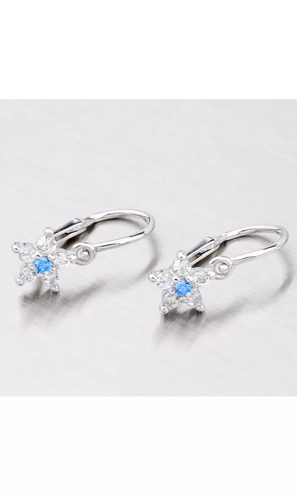 Náušničky v tvare kvietky, sú vyrobené z bieleho štrnásťkarátového zlata 585/1000 v lesklej povrchovej úprave s piatimi bielymi zirkónmi zobrazujúcimi kvietky as jedným modrým zirkónom uprostred.
