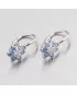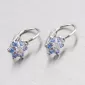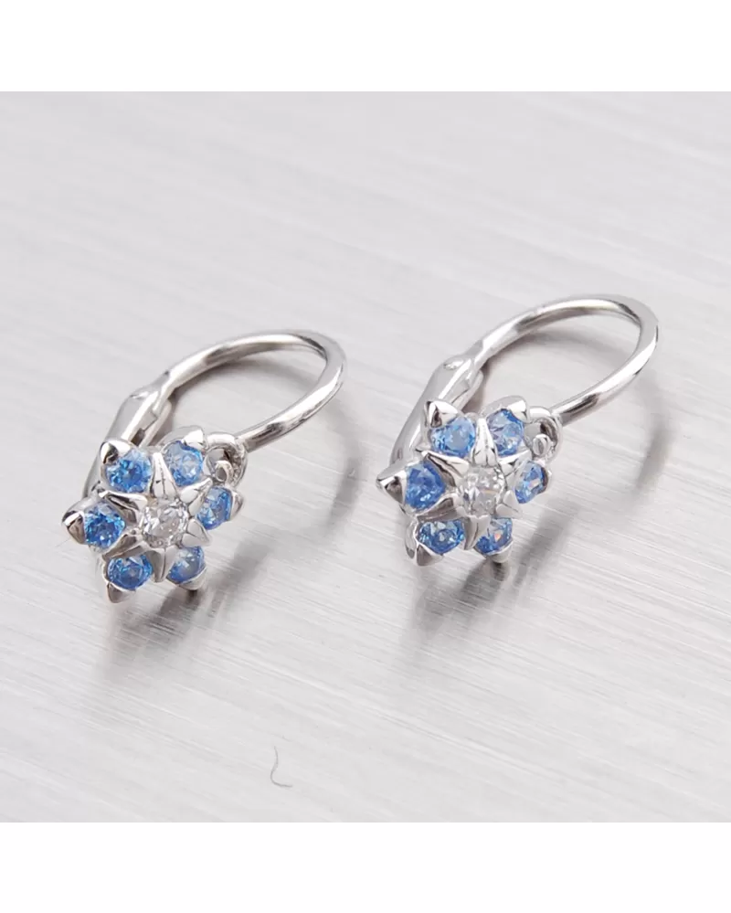 Detské náušnice v tvare kvietky sú vyrobené z bieleho štrnástich karátového zlata 585/1000 v lesklej povrchovej úprave so šiestimi modrými a jedným bielym zirkónom so zapínaním na brizúry.